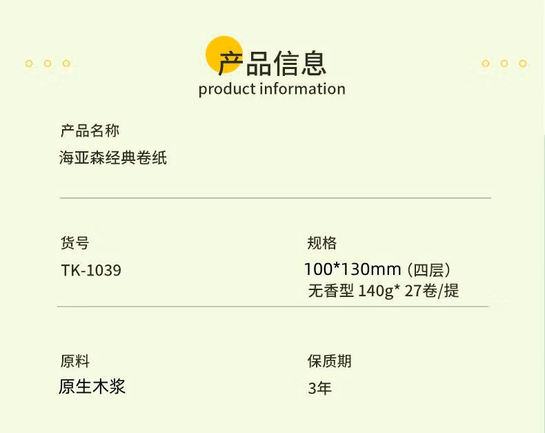 海亚森 TK-1039 102*115mm(四层) 无香型 140g*27卷/箱 27卷/提 经典卷纸 1.00 提/箱 (计价单位:箱) 白色