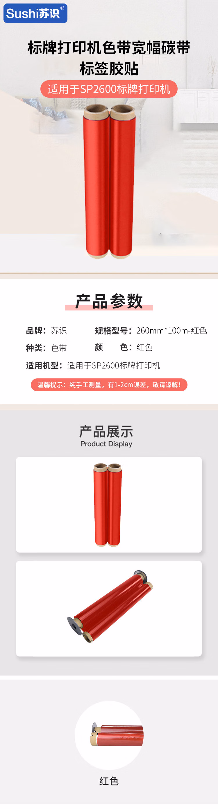 • 商品名称:苏识 260mm*100m-红色 标牌打印机色带宽幅碳带 1.00 盒/卷 (计价单位:卷) 红色