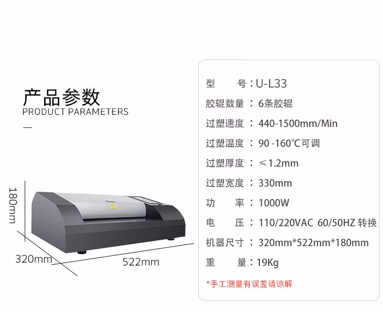 • 商品名称:优玛仕(U-MACH)办公塑封机A3/A4铁壳大型封膜机书文件过胶机压膜机U-L33