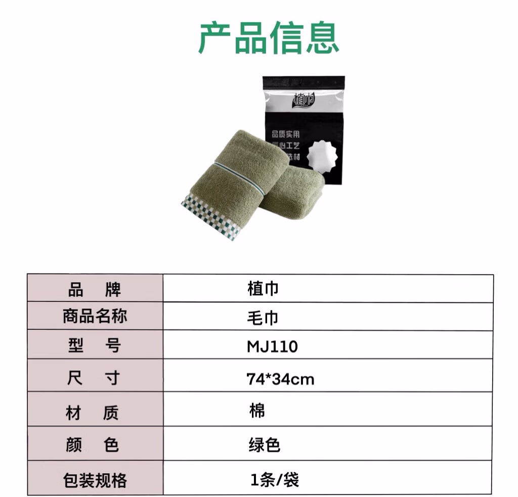 • 商品名称:植巾MJ110 74*34cm 棉 毛巾 (计价单位:条) 绿色