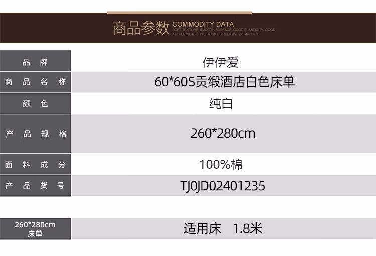 • 商品名称:伊伊爱60*60S贡缎酒店白色床单 白色 260*280cm/TJ0JD02401235