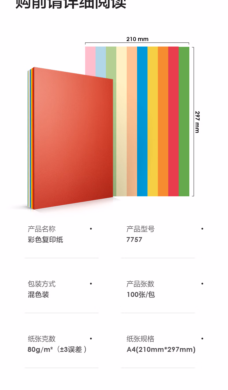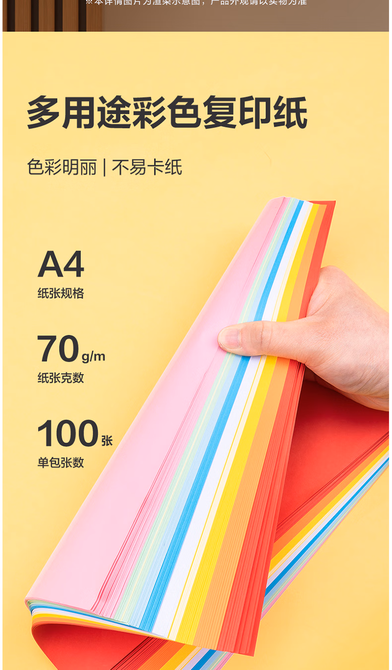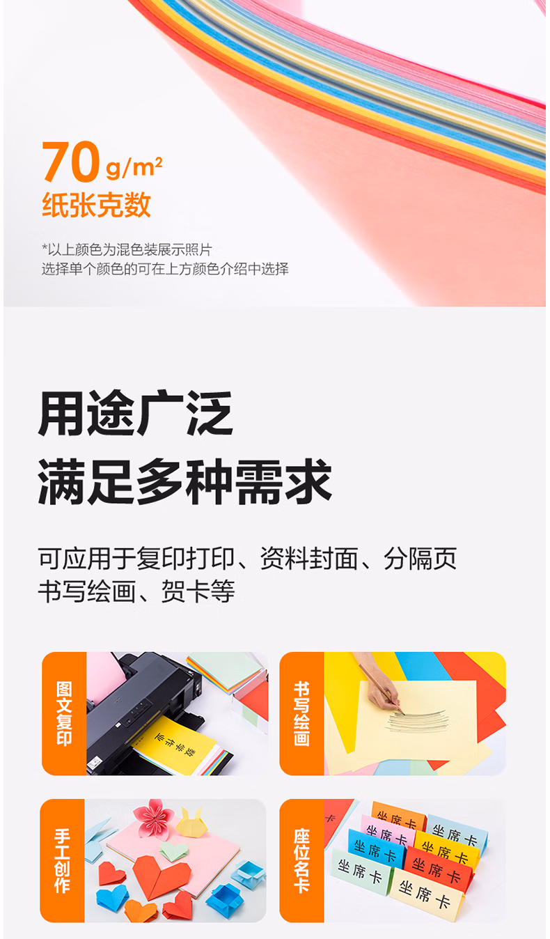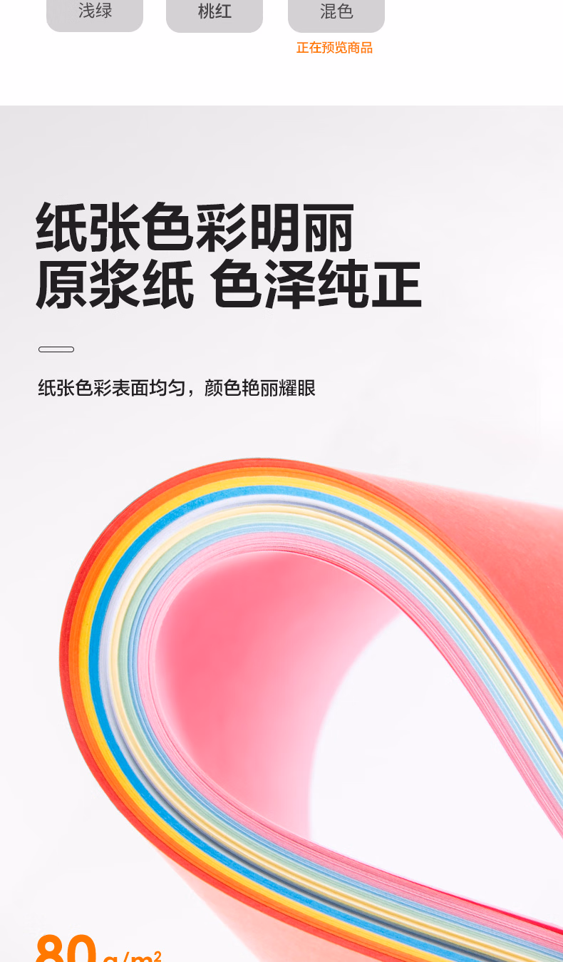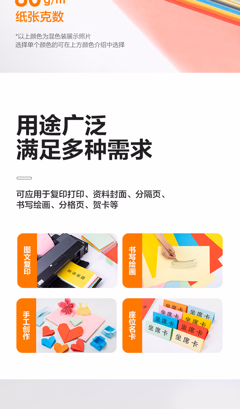 • 商品名称:得力(deli) a4彩色复印纸彩色打印纸开学儿童手工DIY折纸剪纸10色加厚彩纸100张/包混装复印纸幼儿园剪纸 【橙色加厚80G】单包100张