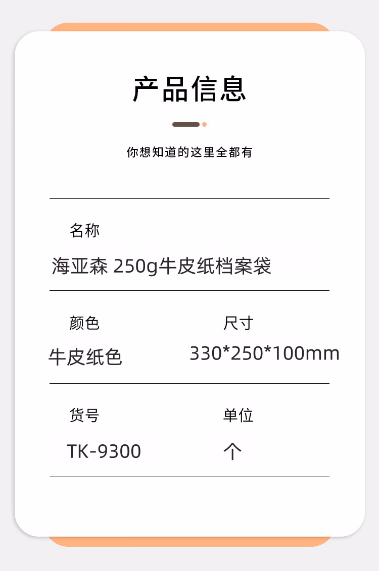 海亚森 TK-9300 330*250*100mm 250g 10个 档案袋 10.00 个/包 (计价单位:包) 牛皮纸色