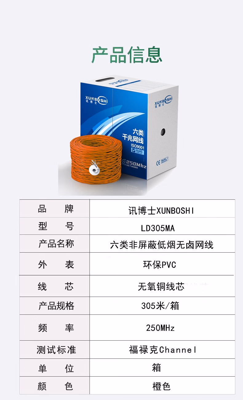 • 商品名称:讯博士(XUNBOSHi) LD305MA 六类非屏蔽低烟无卤网线 305米/箱 (计价单位:箱)