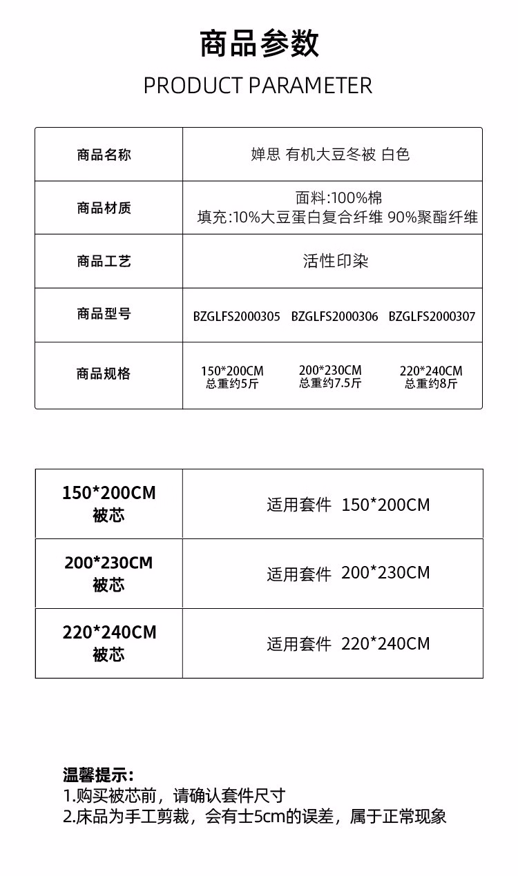 • 商品名称:婵思(CHANSI)(有机)全棉大豆冬被 白色 220*240cm/BZGLFS2000307