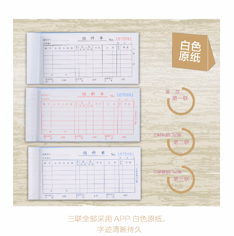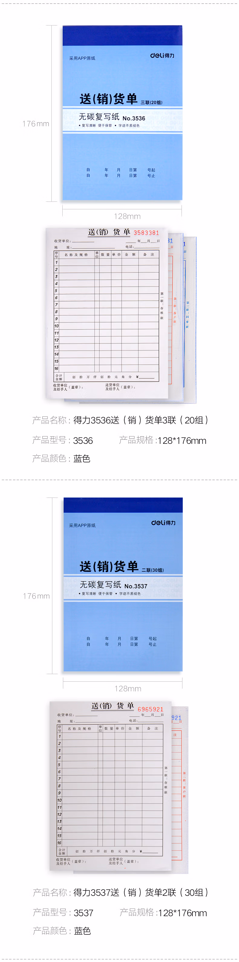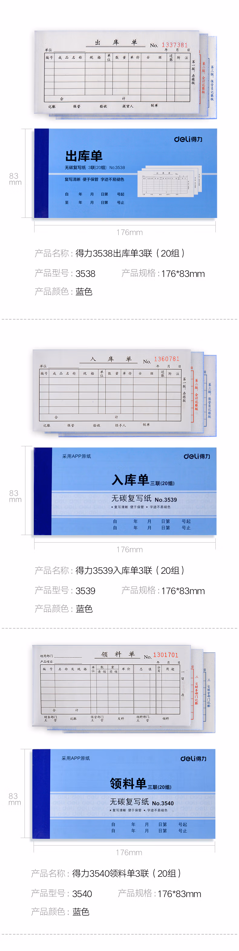 • 商品名称:得力(deli) 单据票据领料出库入库送销货单 无碳复写纸 财务办公用品 3534三联多栏收据单 十本装