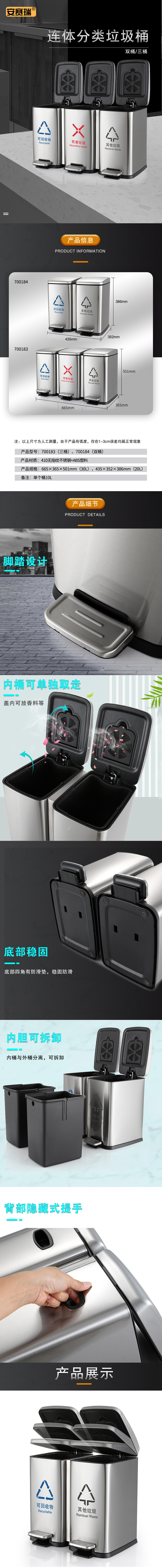 安赛瑞 700183 10L×3 办公干湿垃圾分类桶 室内外连体分类垃圾箱 不锈钢分类脚踏式垃圾桶 3.00 个/组 (计价单位:组) 本色