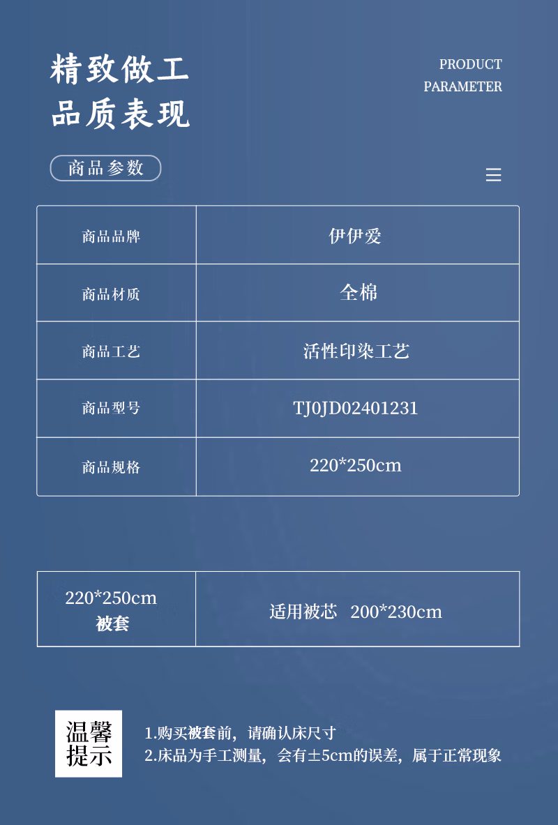 • 商品名称:伊伊爱60*60S贡缎酒店白色被套(适用被芯200*230cm) 白色 220*250cm/TJ0JD02401231