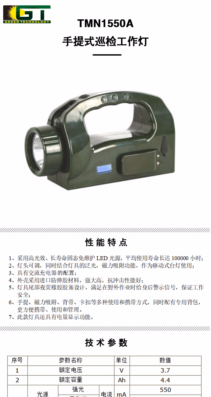 • 商品名称:吉特(GT) TMN1550A-3W 手提式强光巡检工作灯 (计价单位:盏) 绿色 主机