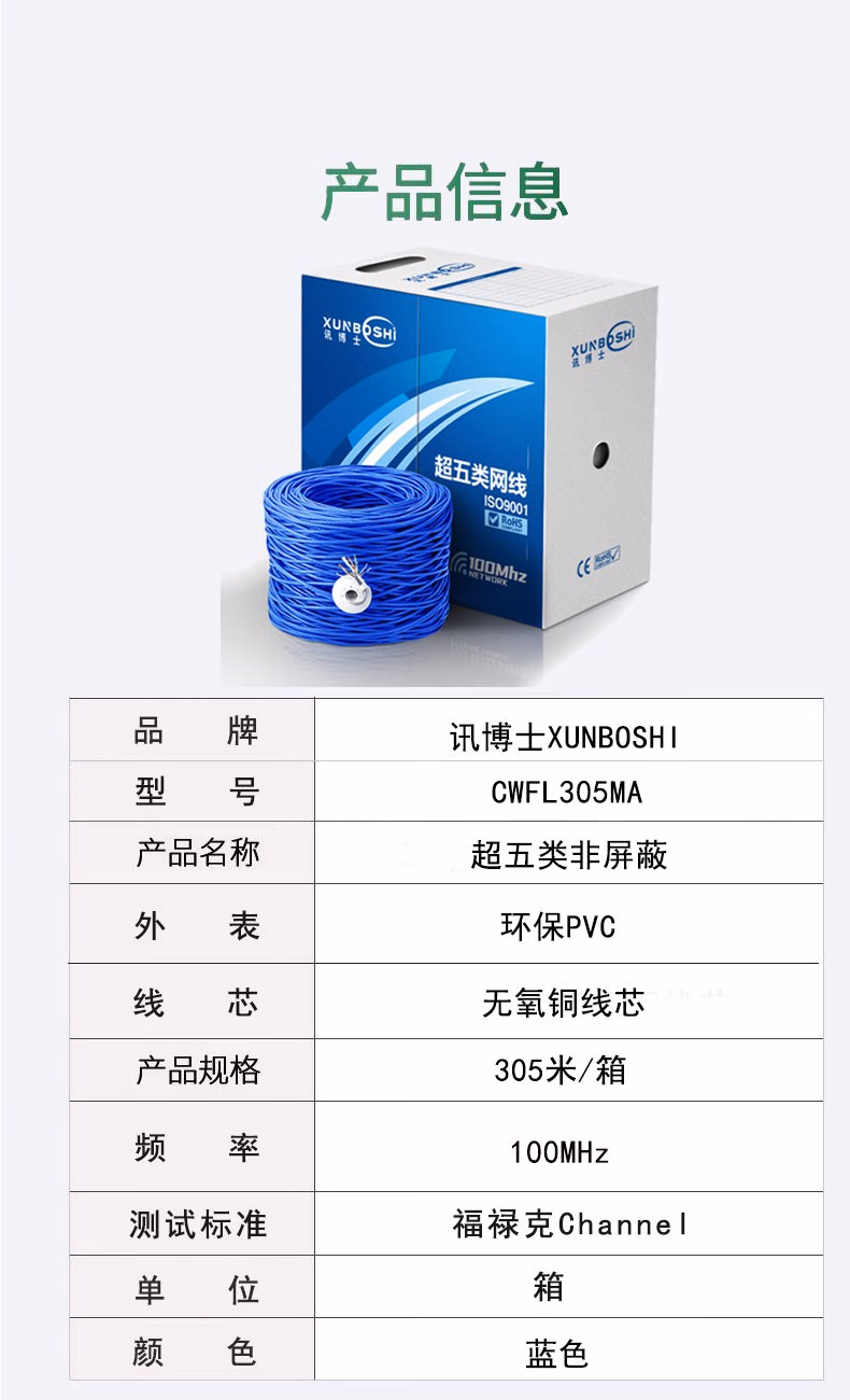• 商品名称:讯博士(XUNBOSHi) CWFL305MA 超五类非屏蔽网线 305米/箱 蓝色