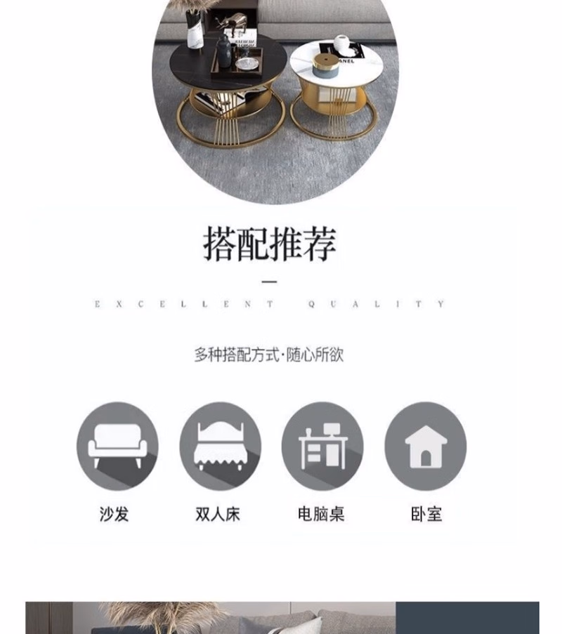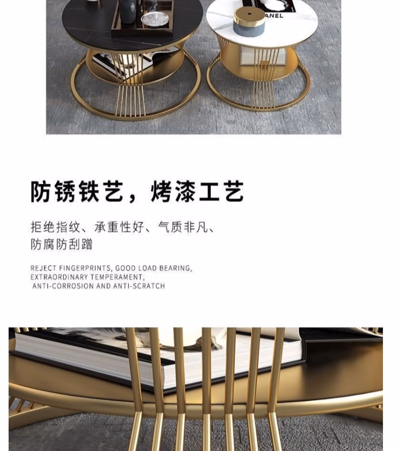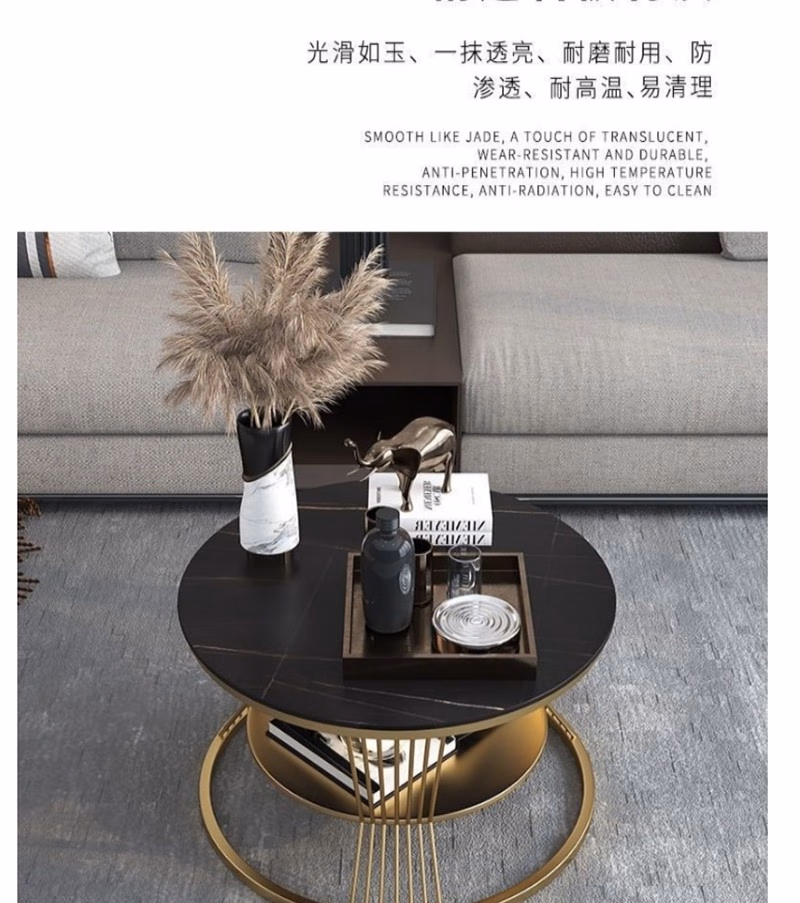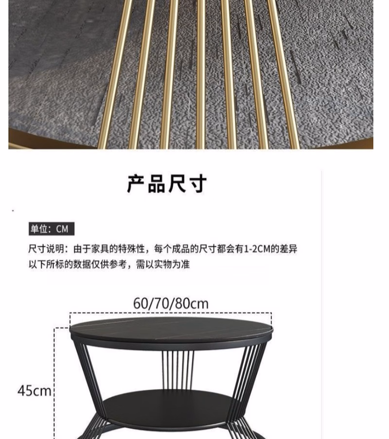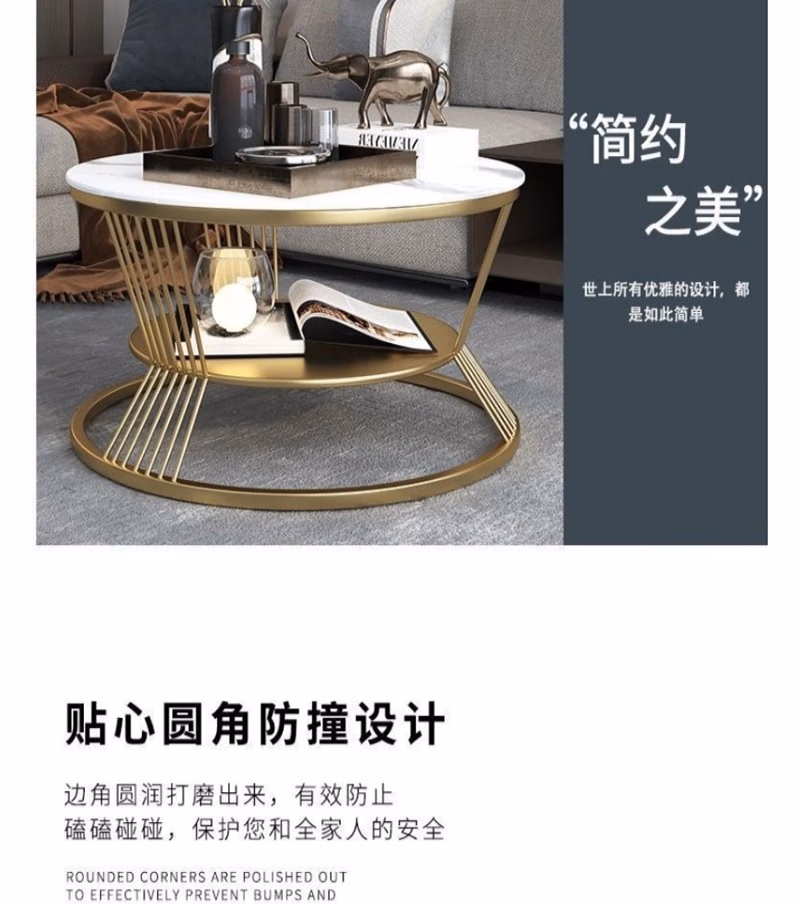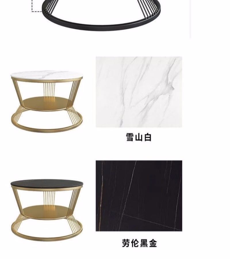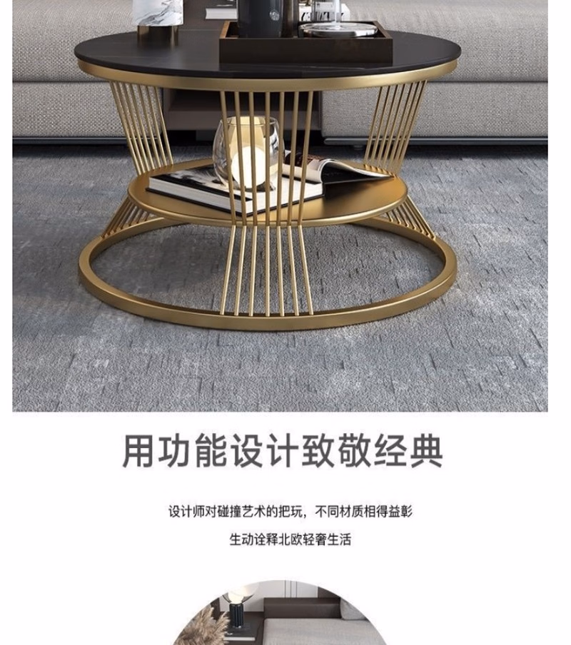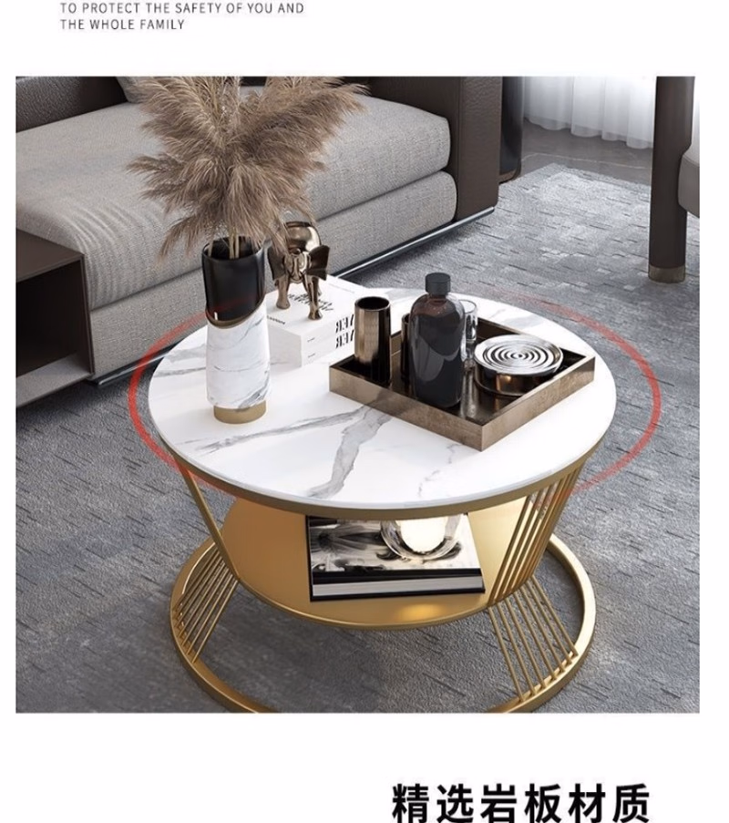 晟泰邦 北欧小户型轻奢大理石圆形双层茶几客厅简约现代岩板茶 雪山白直径80cm(金架)单位:张