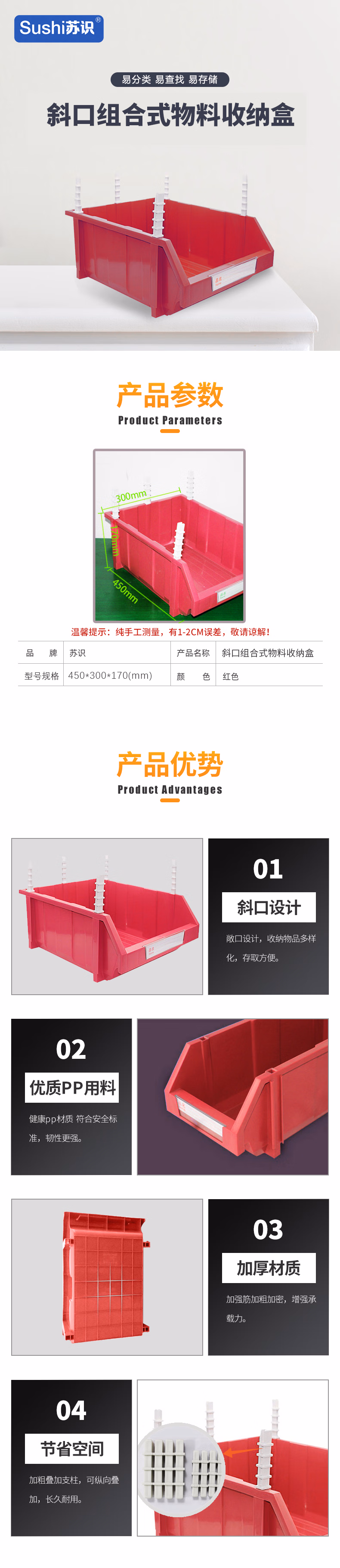 • 商品名称:苏识 450*300*170mm 斜口组合式物料收纳盒 (计价单位:个) 红色