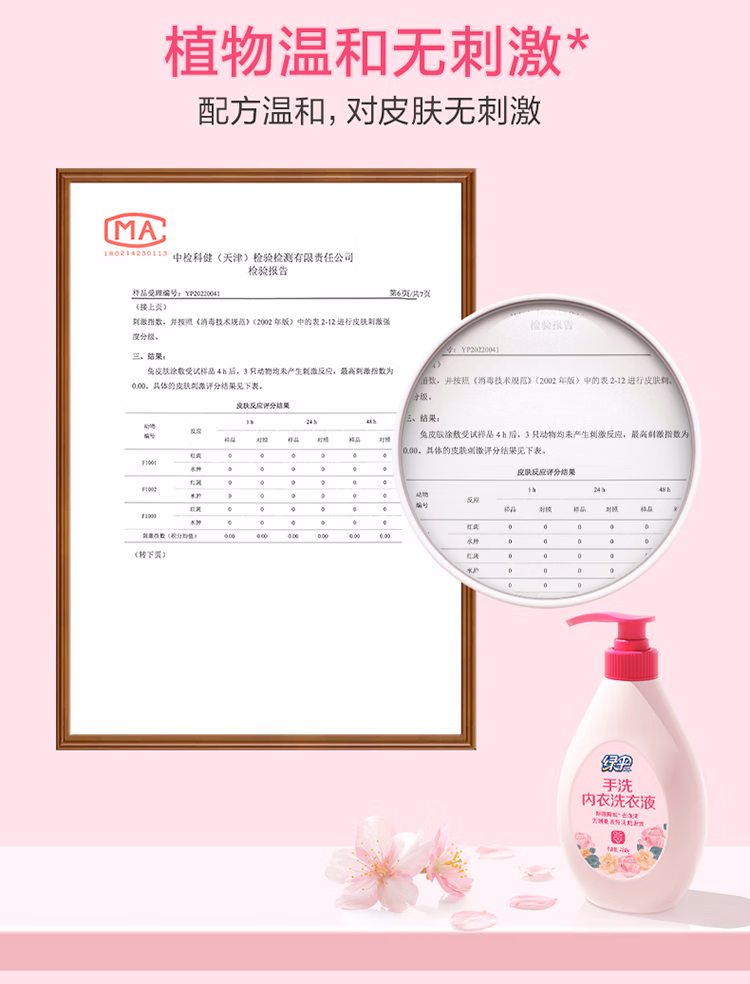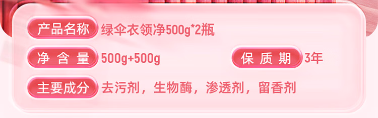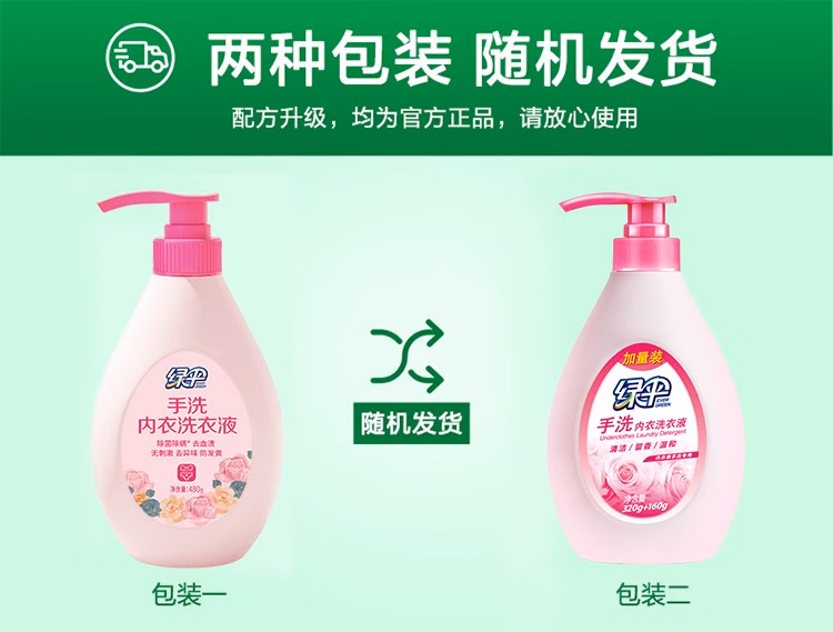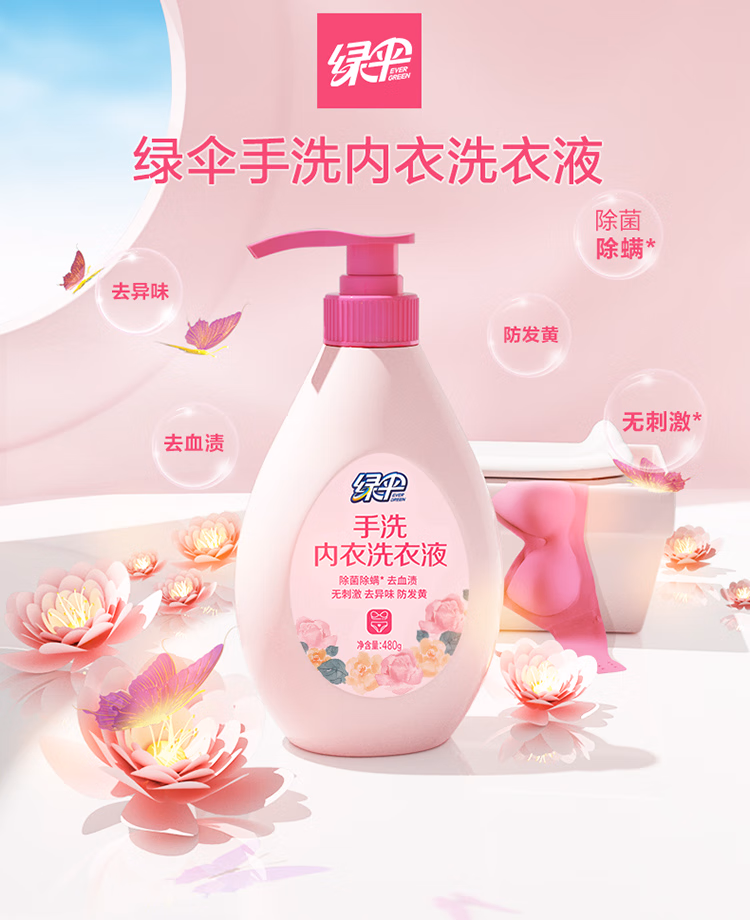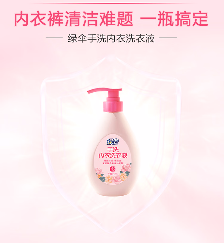 • 商品名称:绿伞 手洗内衣洗衣液 温和亲肤内衣内裤专用洗衣液 防发黄 去除血渍 480g*2瓶
