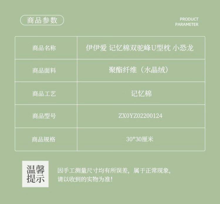• 商品名称:伊伊爱 记忆棉双驼峰U型枕 小恐龙 30*30cm/ZX0YZ02200124