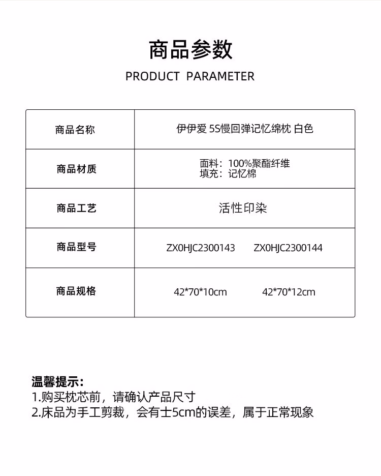 • 商品名称:伊伊爱5S慢回弹记忆绵枕 白色 42*70*10cm/ZX0HJC2300143