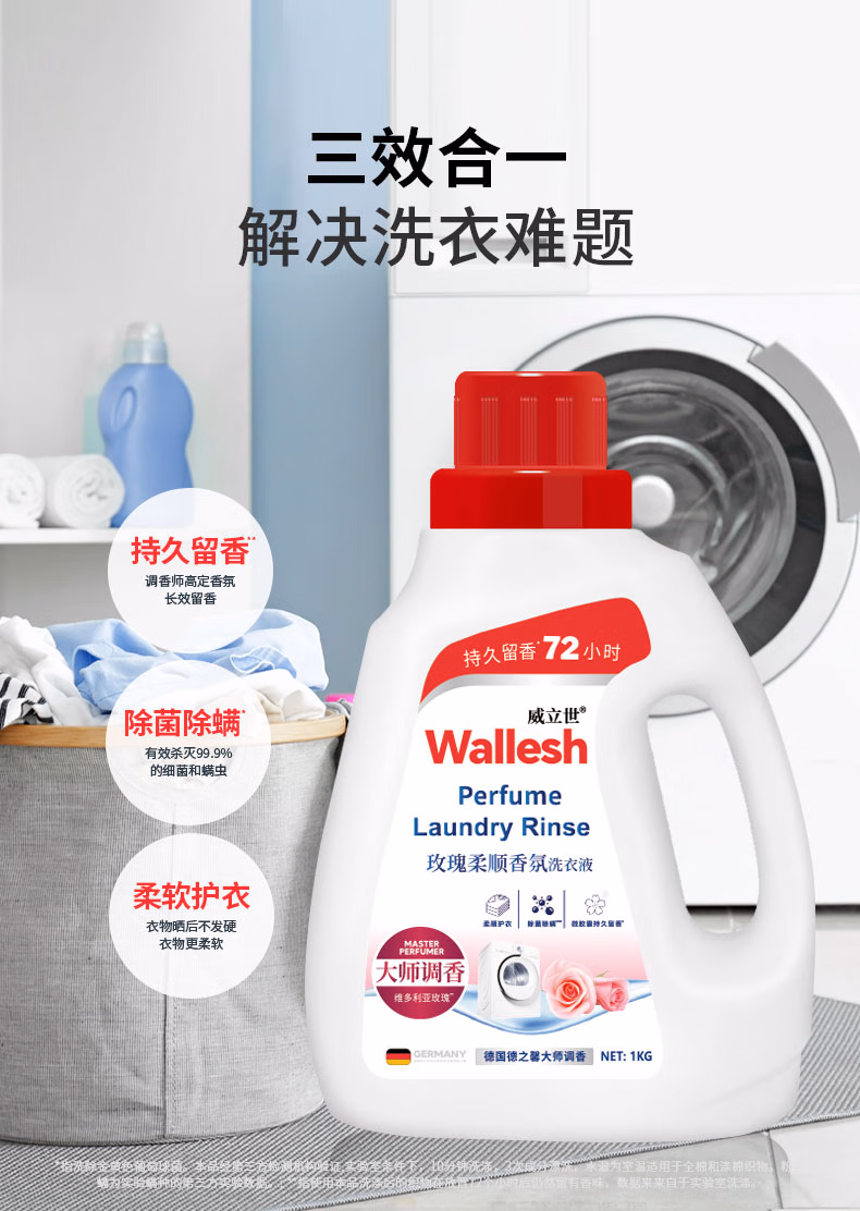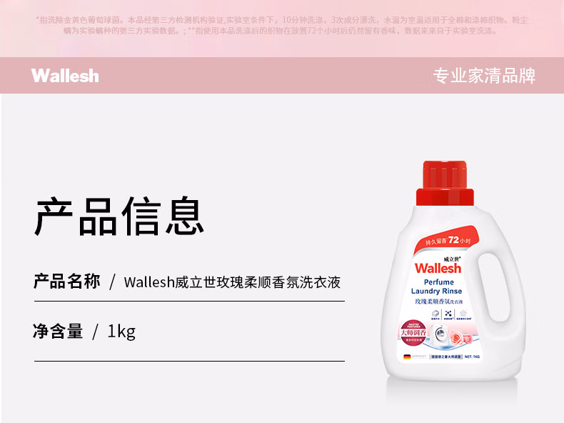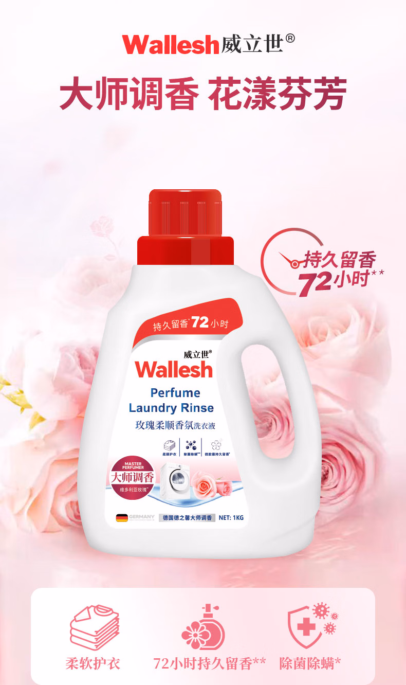 • 商品名称:威立世Wallesh玫瑰柔顺香氛洗衣液1kg持久留香除菌除螨大师调香 玫瑰 洗衣液