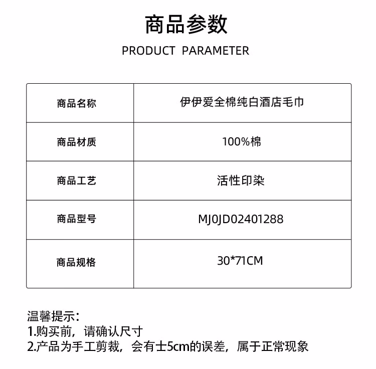 • 商品名称:伊伊爱全棉纯白酒店毛巾 30*71/MJ0JD02401288白色 1条