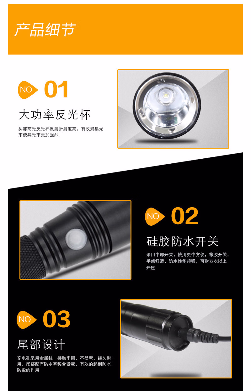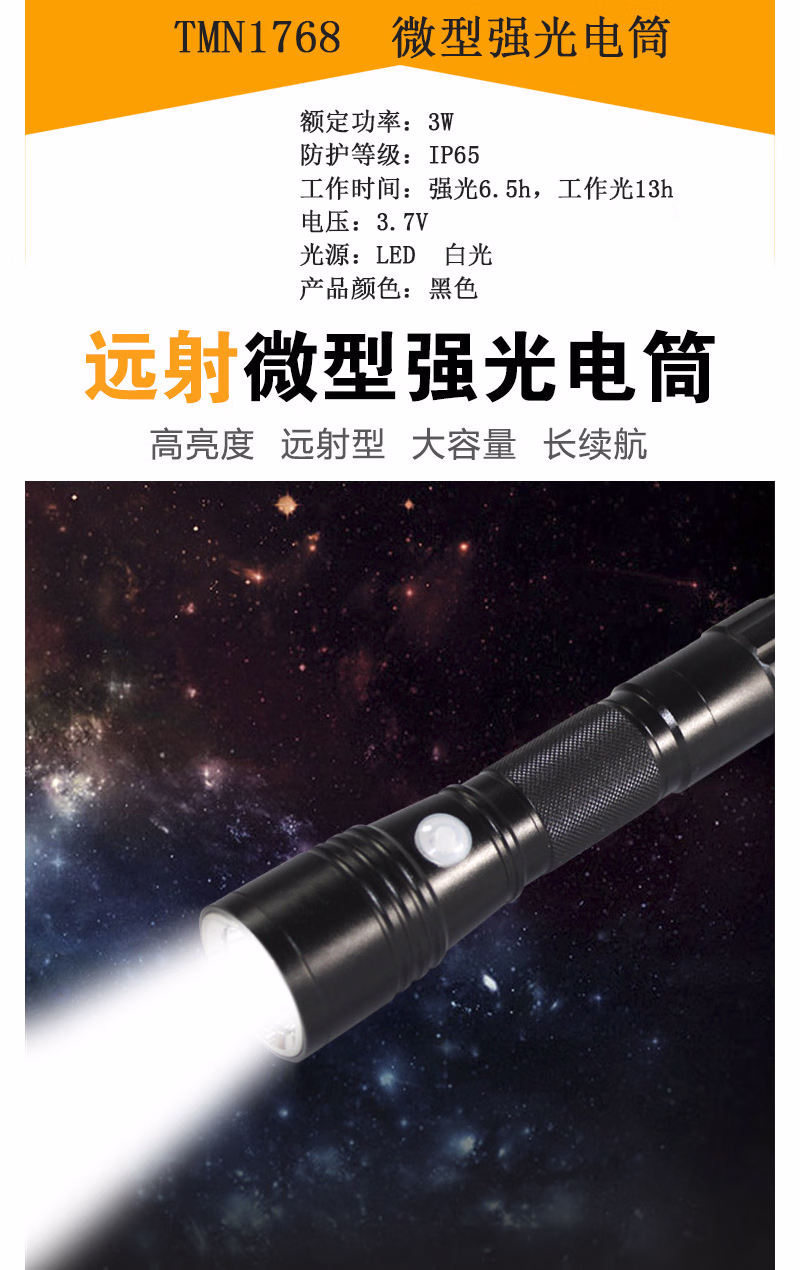 吉特(GT) TMN1768 3W IP65 强光6.5h 工作光13h 电压3.7V LED 白光 微型强光电筒 (计价单位:个) 黑色
