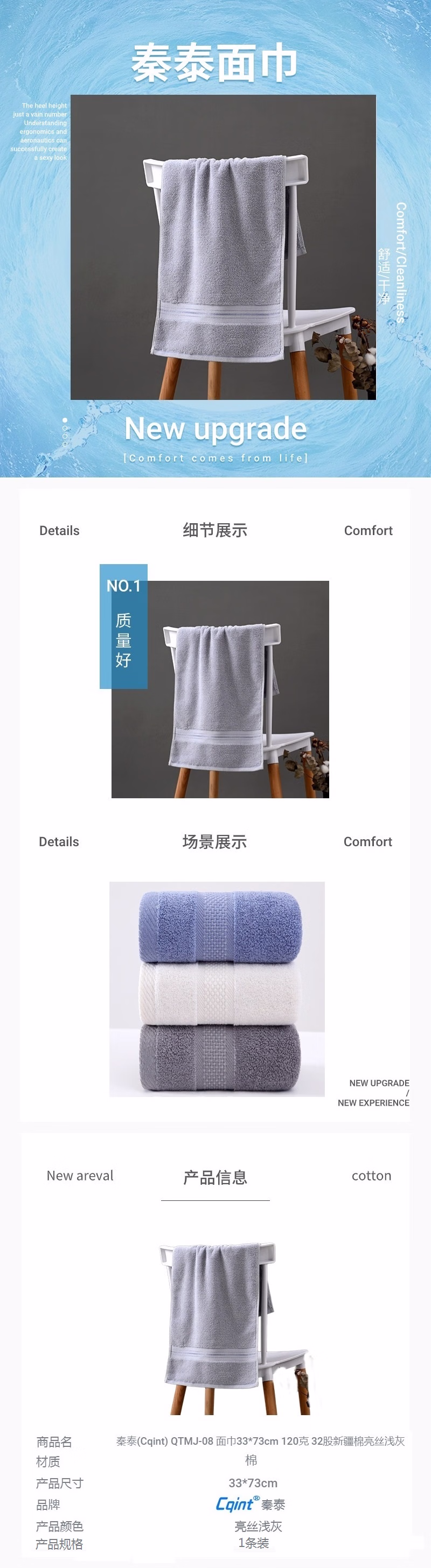 秦泰(Cqint) QTMJ-08 33*73cm 120克 32股新疆棉亮丝 毛巾 (计价单位:条) 浅灰