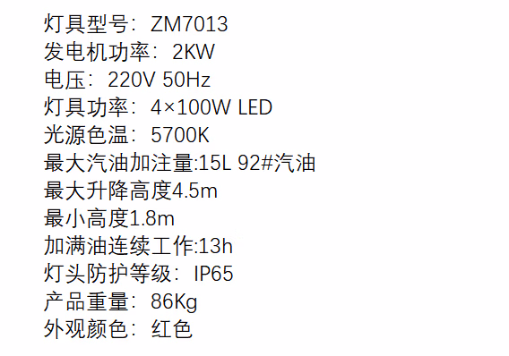 晫安联 ZM7013 4×100W IP65 220V 2KW发电机 续航时间≥13h 5700K LED 自动升降工作灯 (计价单位:台) 红色