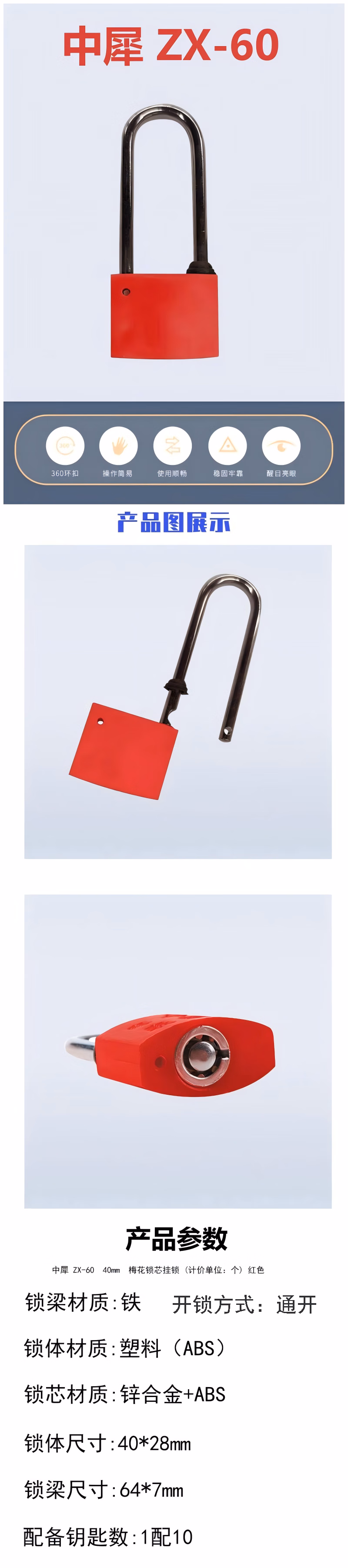 中犀 ZX-60 40mm 梅花锁芯 挂锁 (计价单位:个) 红色