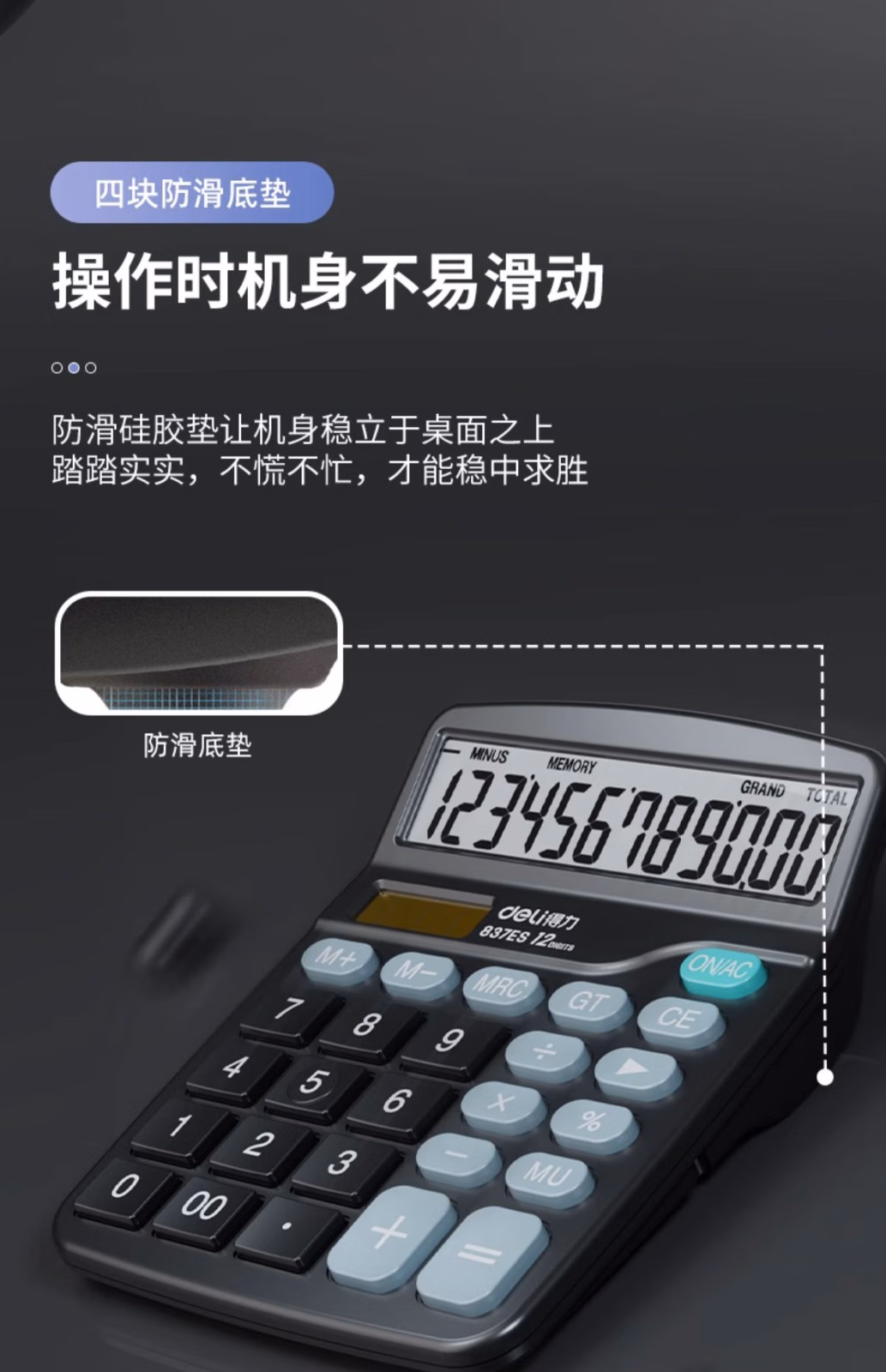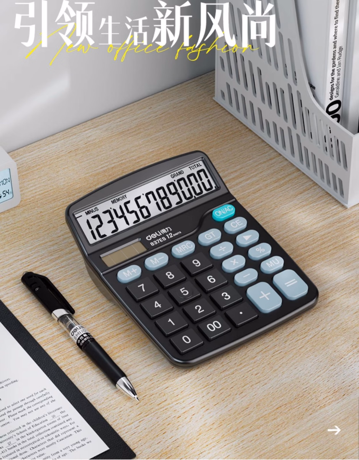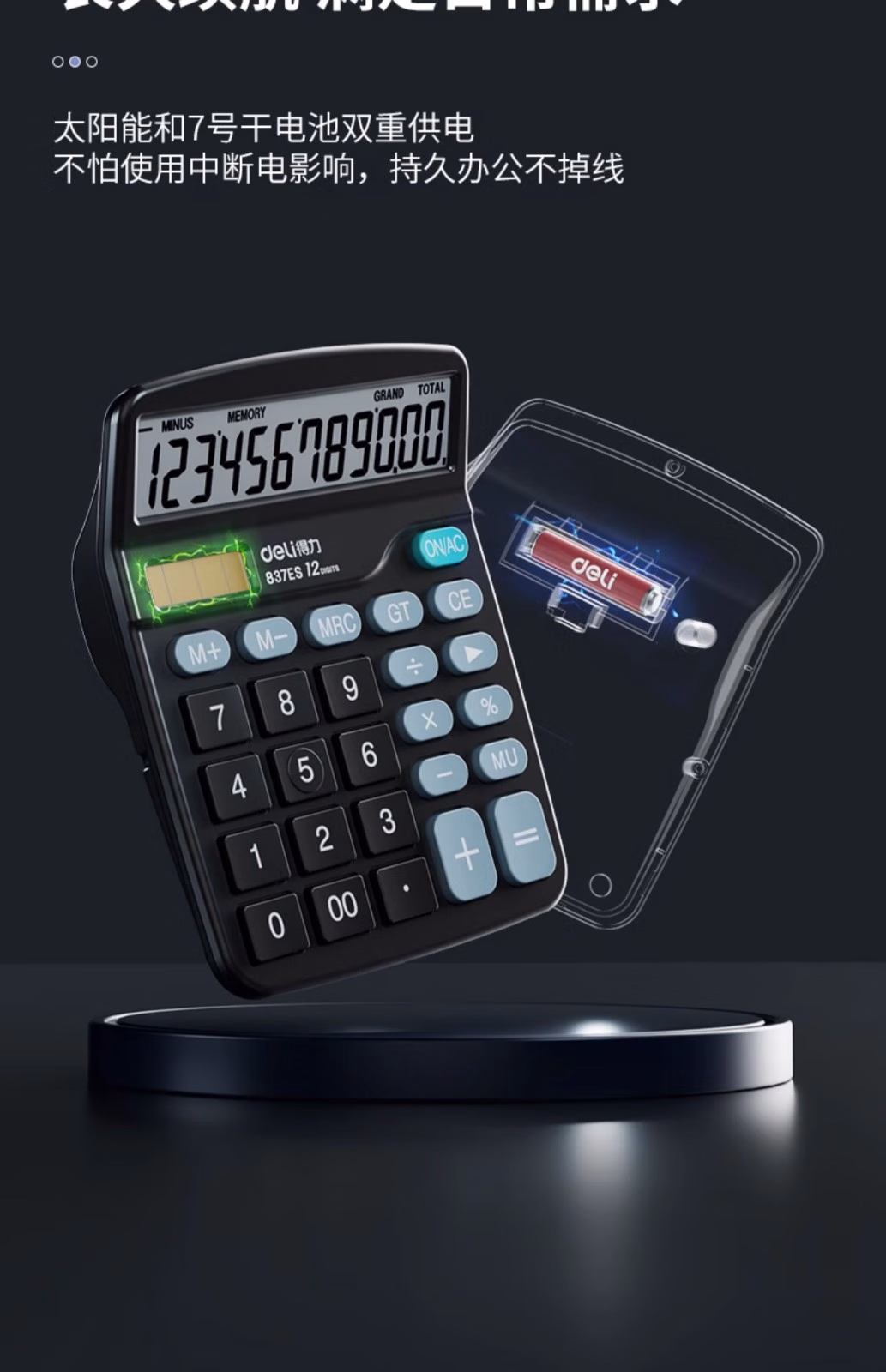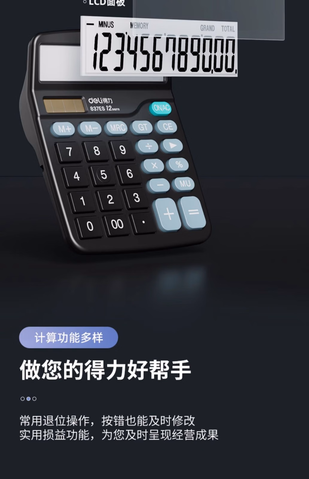 • 商品名称:得力(deli)837双电源桌面办公计算器12位大屏幕会计用太阳能学生用财务小号便携桌面计算机 【牛奶白】双电源+非语音 TE837C