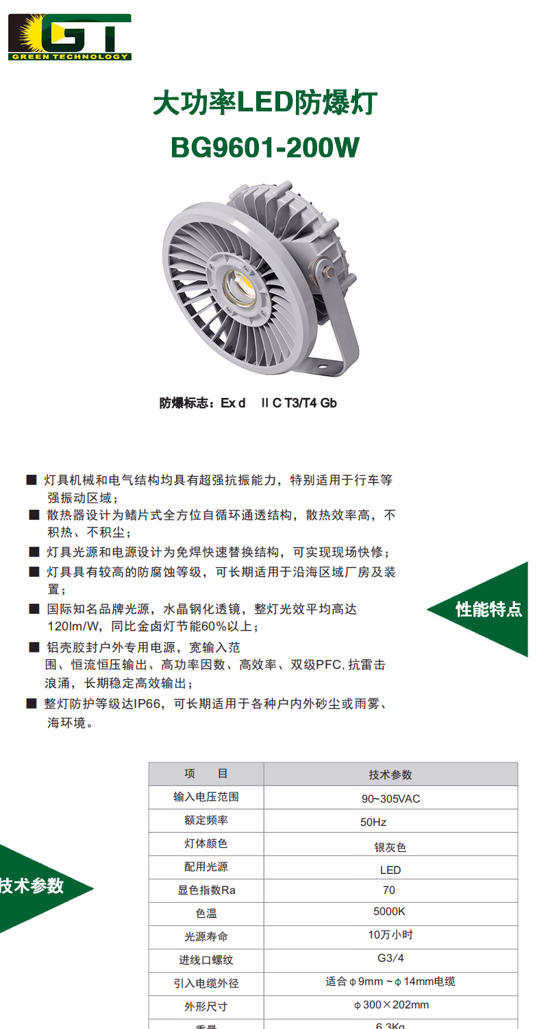 吉特(GT) BG9601-200W 200W IP66 Ex d ⅡC T3/T4 Gb 电压90~305VAC LED 色温5000K 大功率LED防爆灯 (计价单位:盏) 银灰色