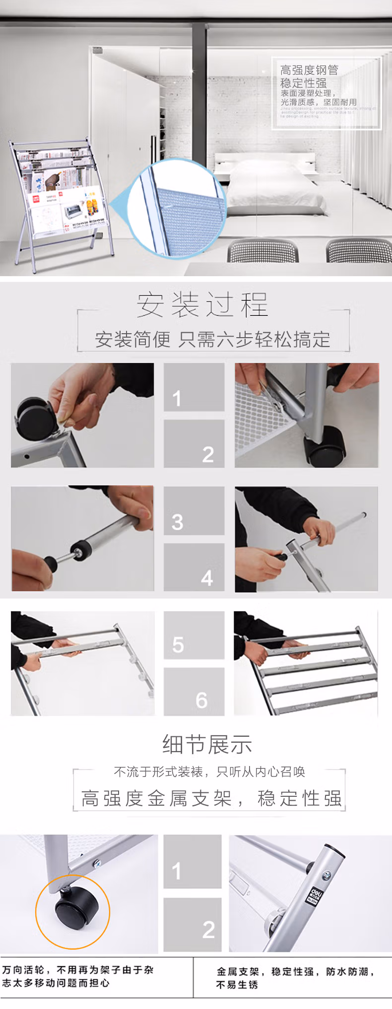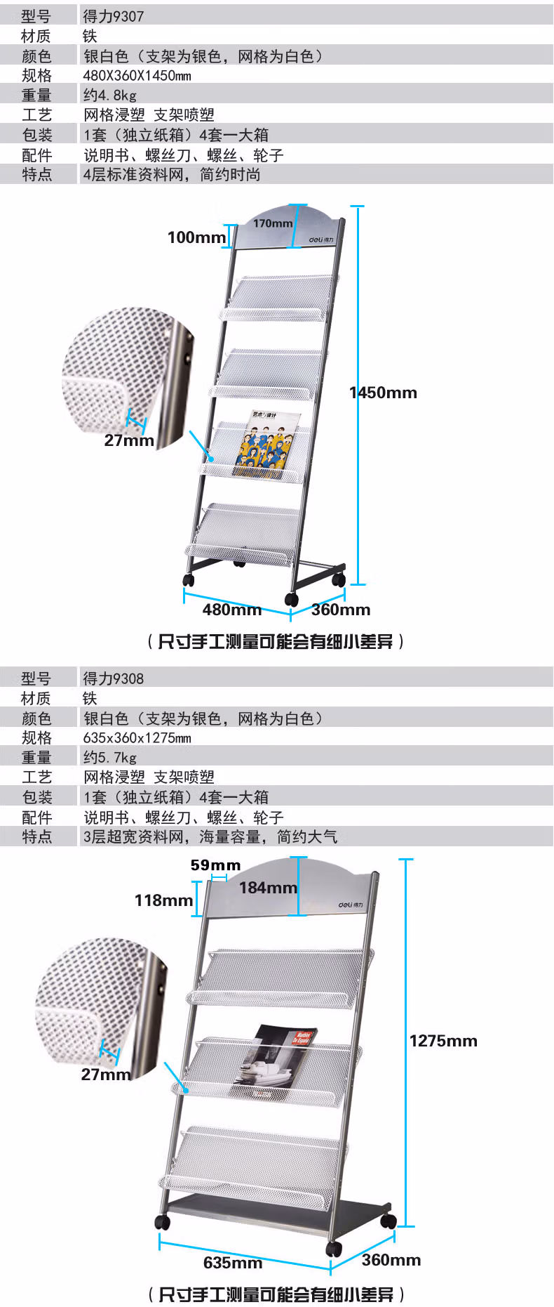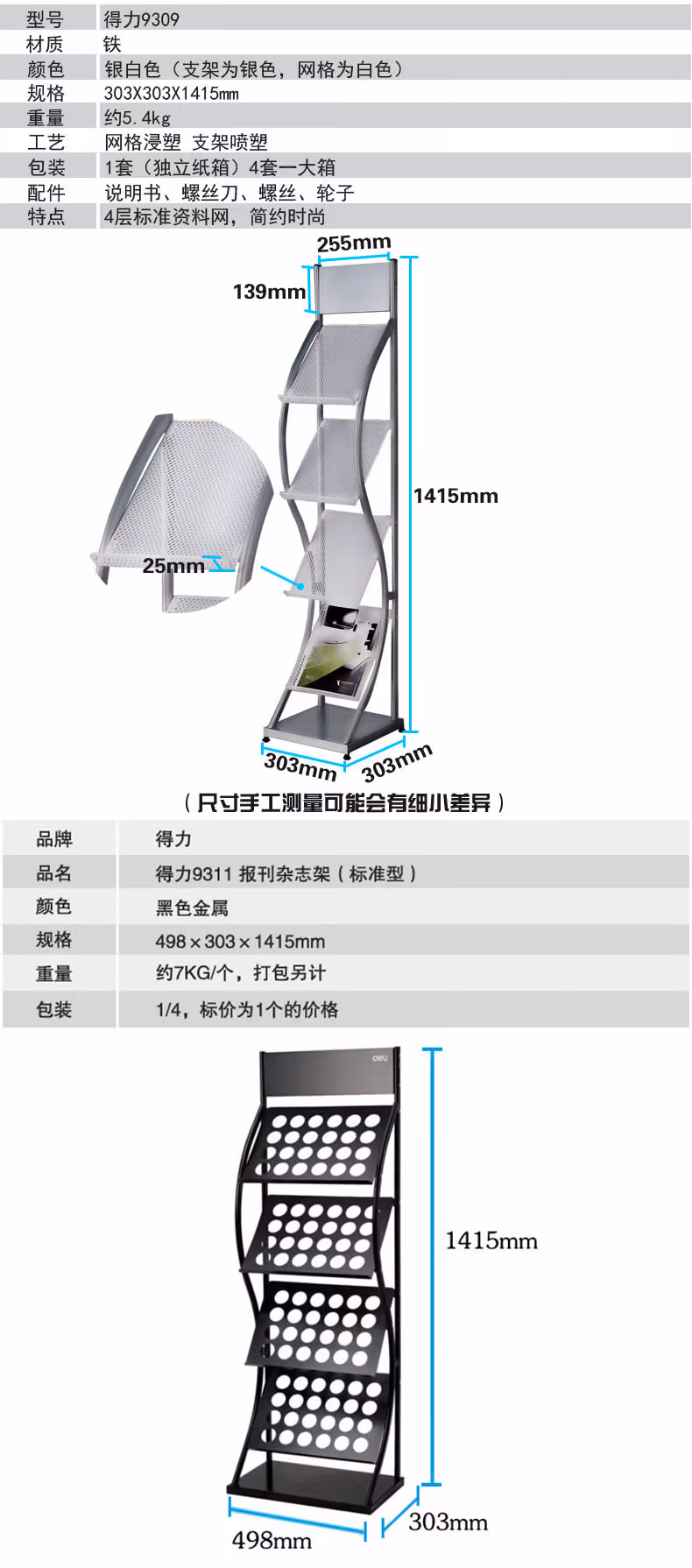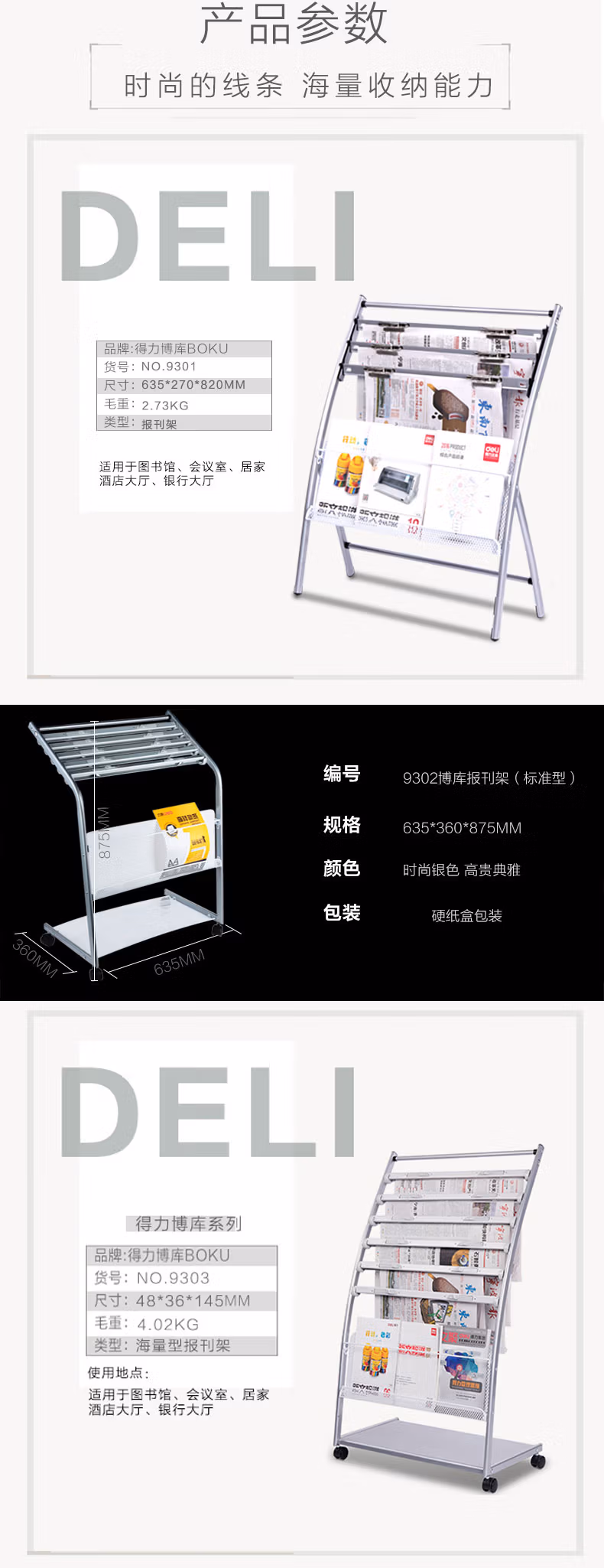 • 商品名称:得力 (deli) 报刊架标准多用型书报杂志架资料展示宣传架子办公 9303(635*360*1080mm)海量型
