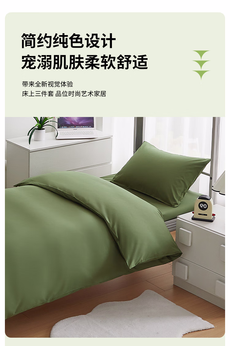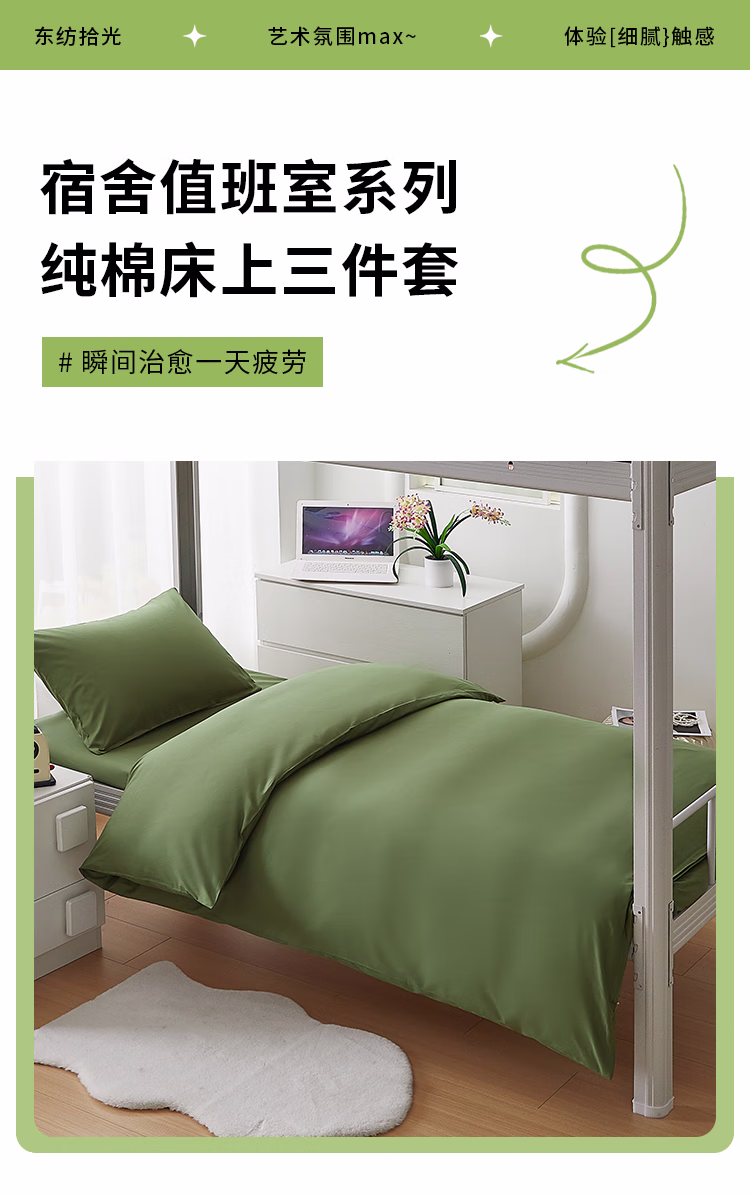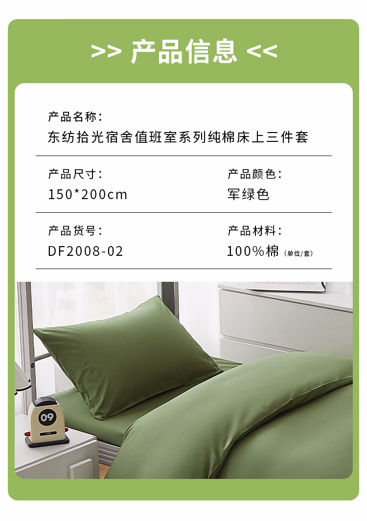 • 商品名称:东纺拾光宿舍值班室系列纯棉床上三件套 150*200cm 军绿色(单位:套)