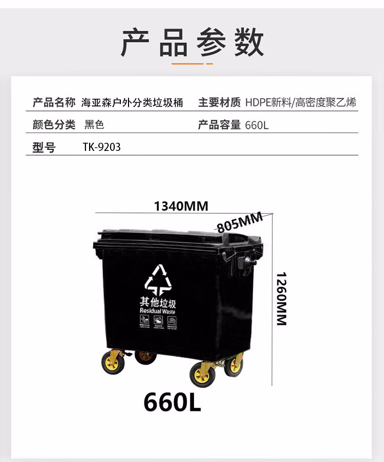 海亚森 TK-9203 其他垃圾 660L 户外可挂式分类 垃圾桶 (计价单位:个) 黑色