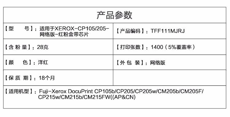 天威(PrintRite) CP105/205 专业装 打印量1400页 适用富士施乐CP105b系列 粉盒 1.00 只/支 (计价单位:支) 红色