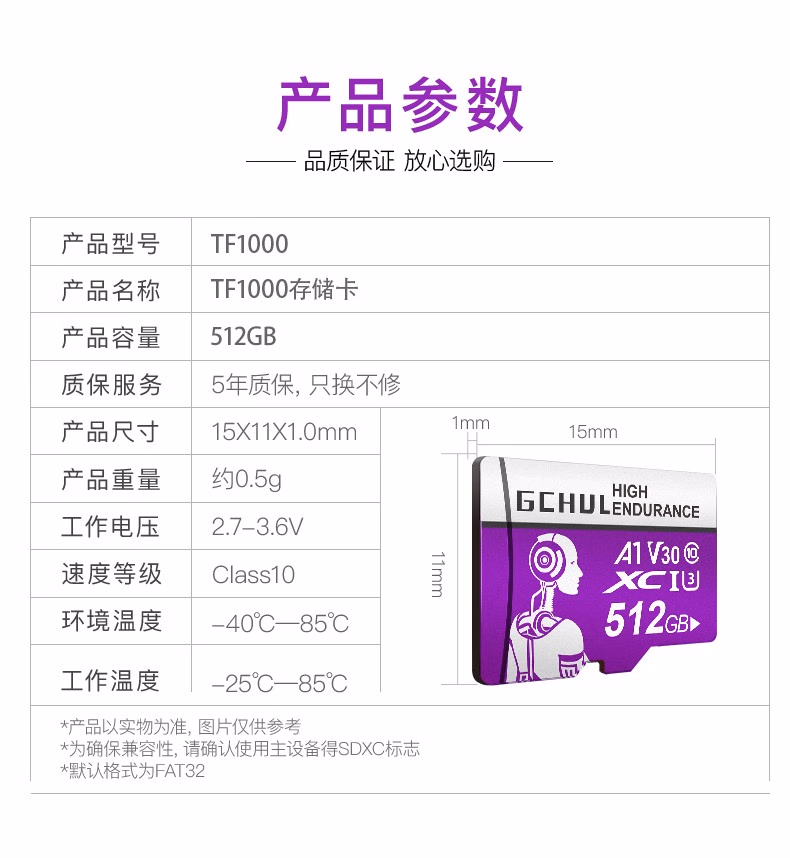 • 商品名称:杰储(GCHUL) TF1000 512G TF卡 存储卡 (计价单位:个) 灰色