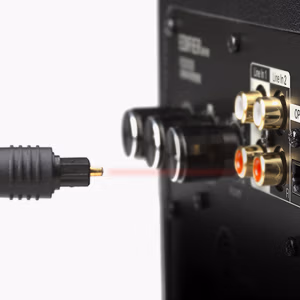 具有光纤输入,并标配高品质光纤线缆,可以接驳电视、电视盒子、游戏机等具有光纤输出的播放设备,直连无损耗。