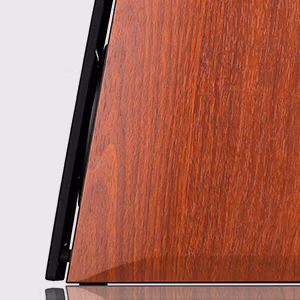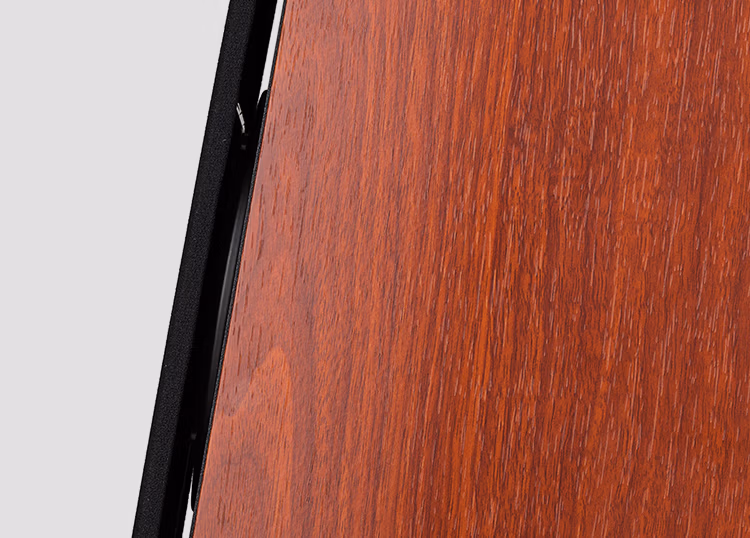 不规则梯形箱体结构,既可以减少驻波干扰,音质更纯净,外观又雅致而不呆板,并与家居出色融合,成为家居的一部分。特有的小仰角设计,大大减少了桌面反射声对声音重放时的干扰,音色更加自然、清晰。 全新配色的名贵胡桃木纹路贴面侧板,与黑色箱体框架相得益彰,稳重而更具HIFI味道。