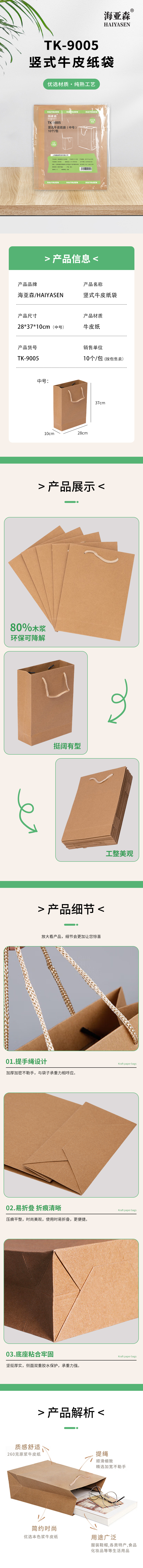 海亚森 TK-9005 28*37*10cm (棉绳黄浆)中号 竖式牛皮纸袋 10.00 个/包 (计价单位:包) 本色