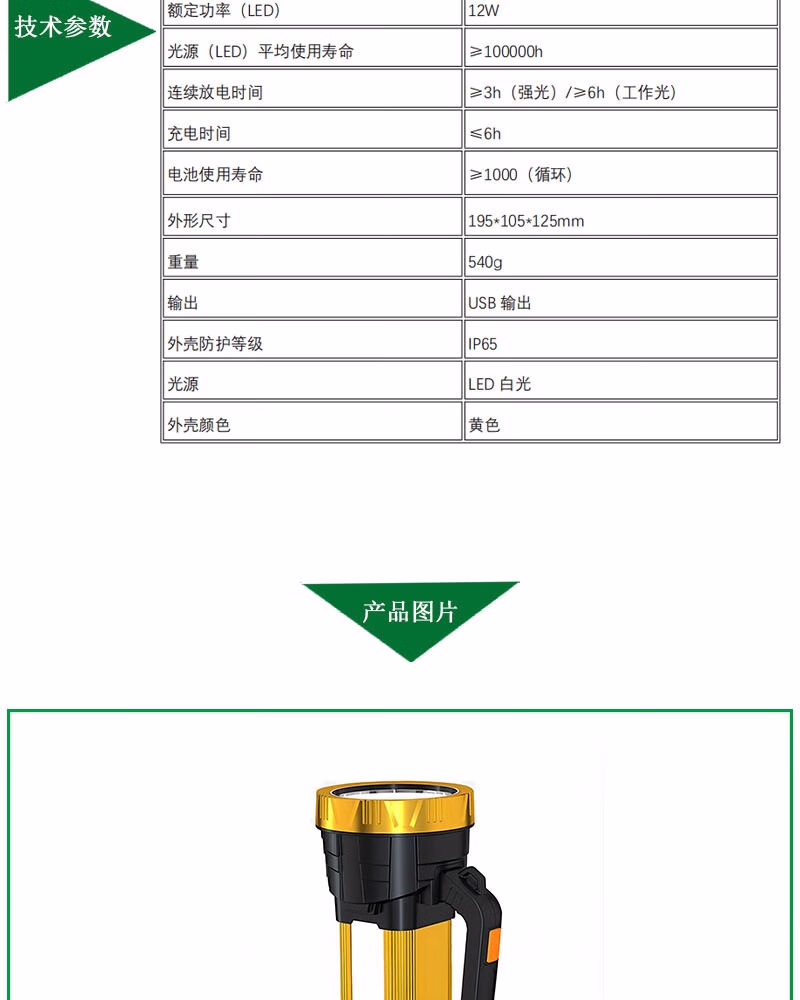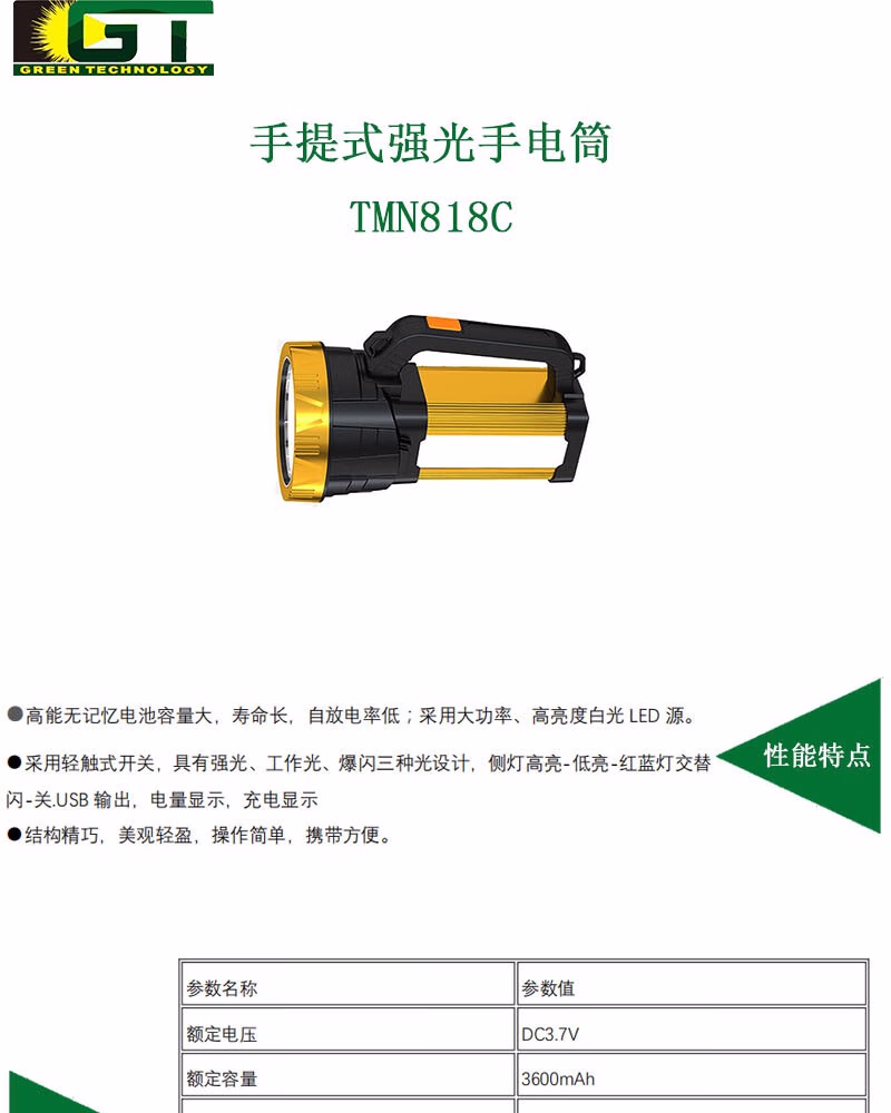 吉特(GT) TMN818C 12W IP65 工作光6h DC3.7V 白光 LED 手提式强光手电筒 (计价单位:盏) 黄色