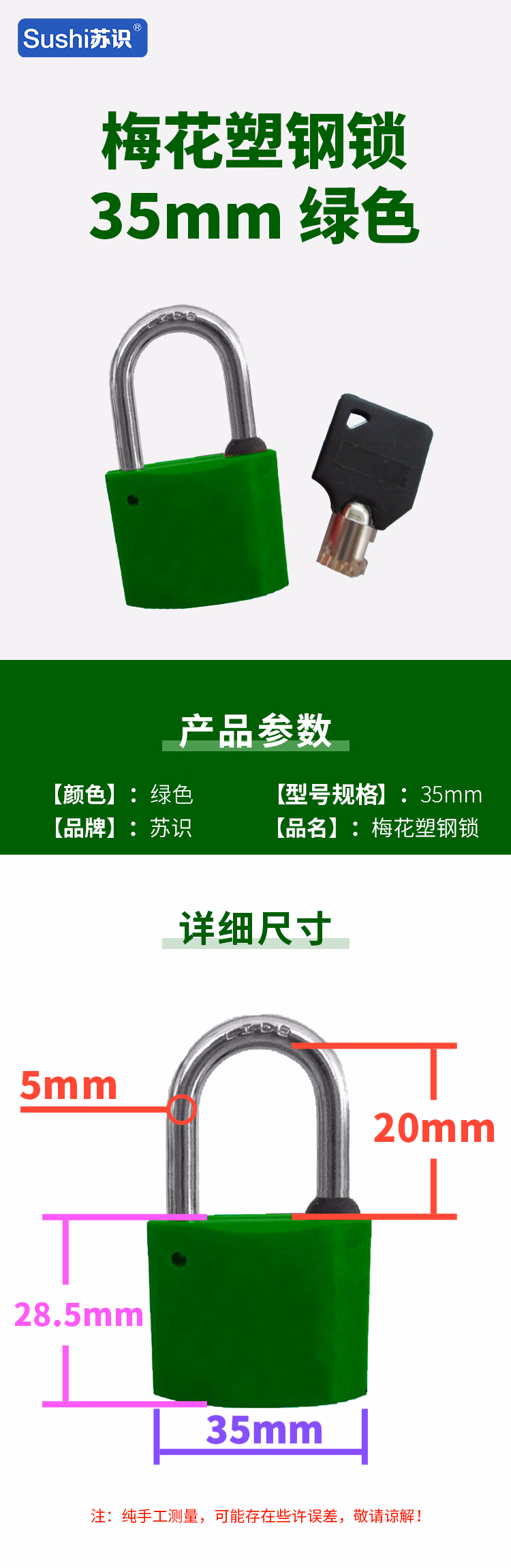 • 商品名称:苏识 35mm 绿色 梅花塑钢锁 1.00 个/把 (计价单位:把) 绿色