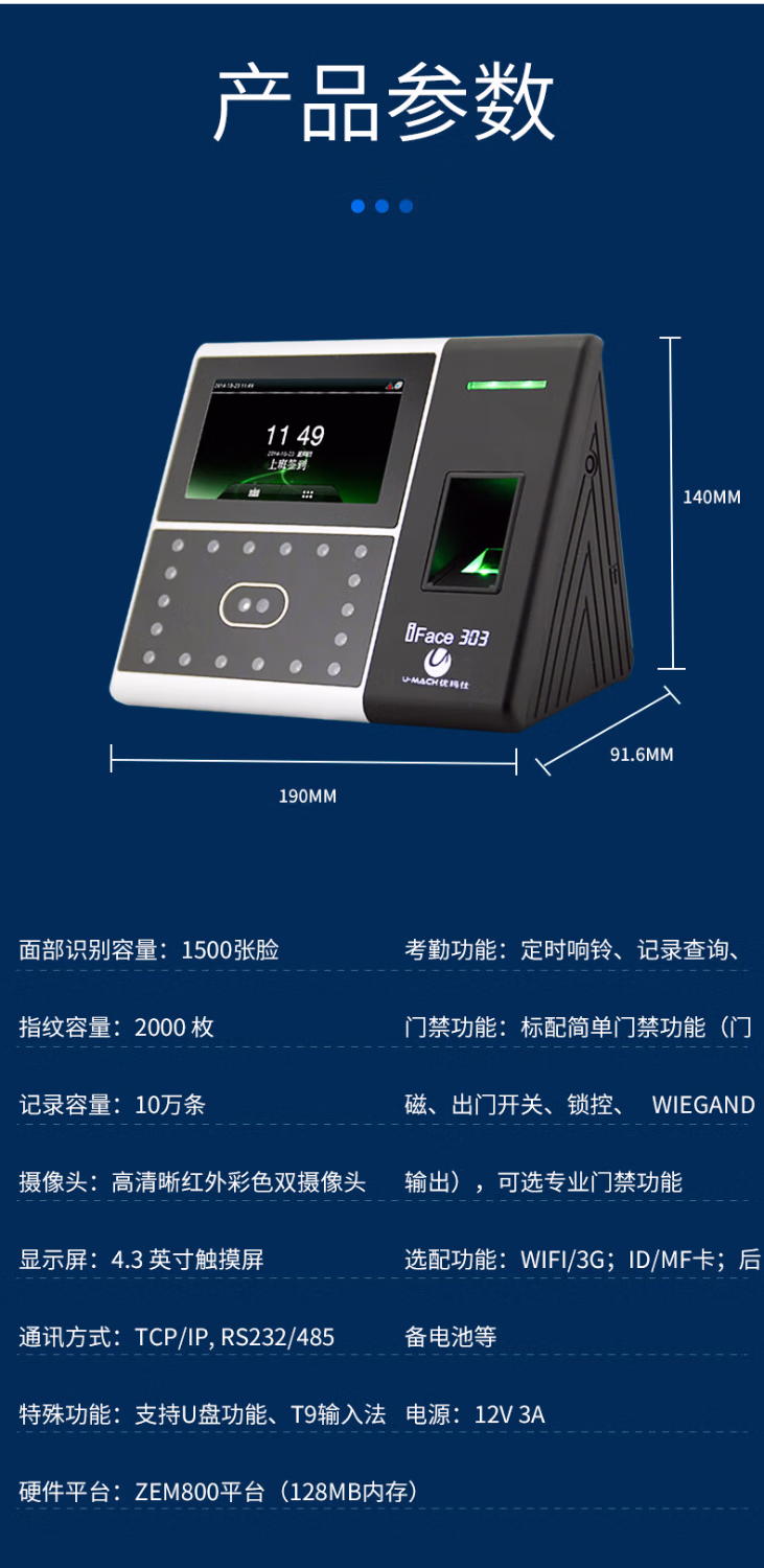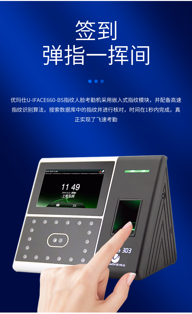 • 商品名称:优玛仕U-iFace303-BS指纹考勤机人脸面部识别考勤机考勤员工上下班刷脸手指签到联网一体机