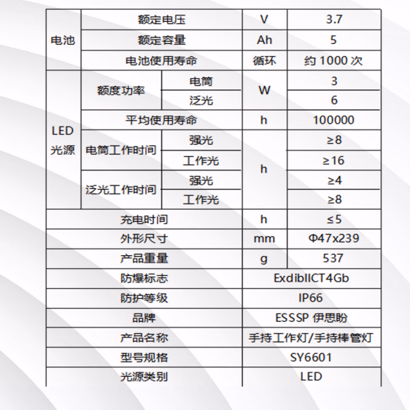 伊思盼(ESSSP) SY6601 6W IP66 ExdibIICT4Gb 16h 3.7V 5000K LED 手持工作灯 (计价单位:盏) 黑色