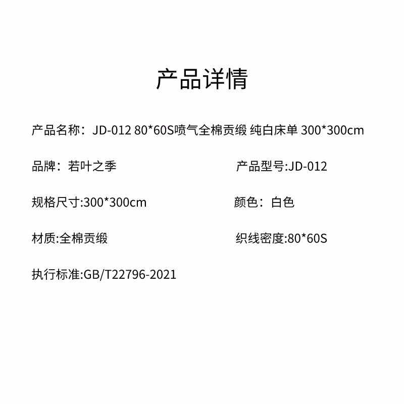 若叶之季 JD-012 300*300cm 纱支80*60 全棉 床单 (计价单位:件) 白色
