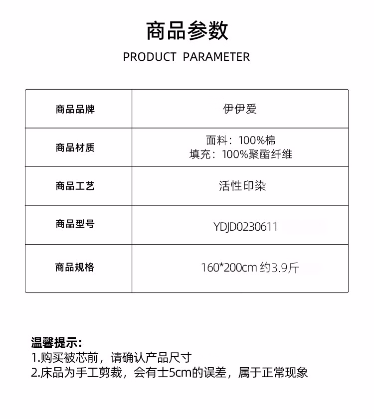 伊伊爱 YDJD0230611/160*200cm(约3.9斤) 全棉防羽布纯白春秋被芯 (计价单位:件) 白色