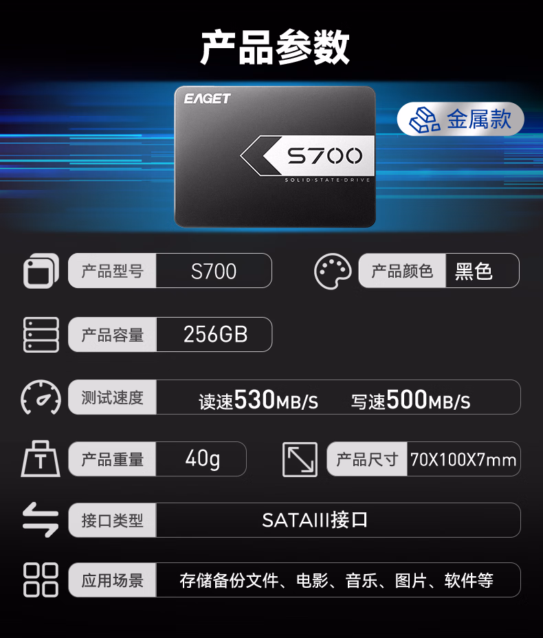忆捷(EAGET) S700-256G SATA3 2.5英寸 固态硬盘 (计价单位:个) 黑色