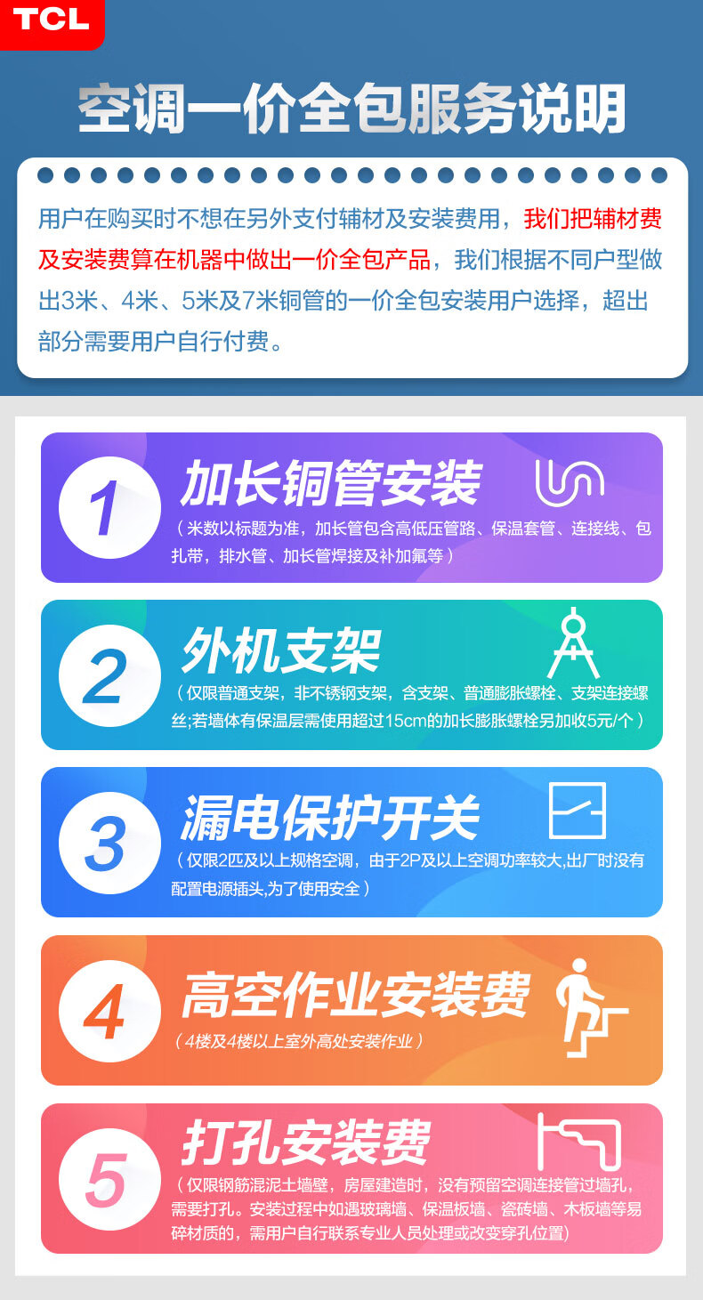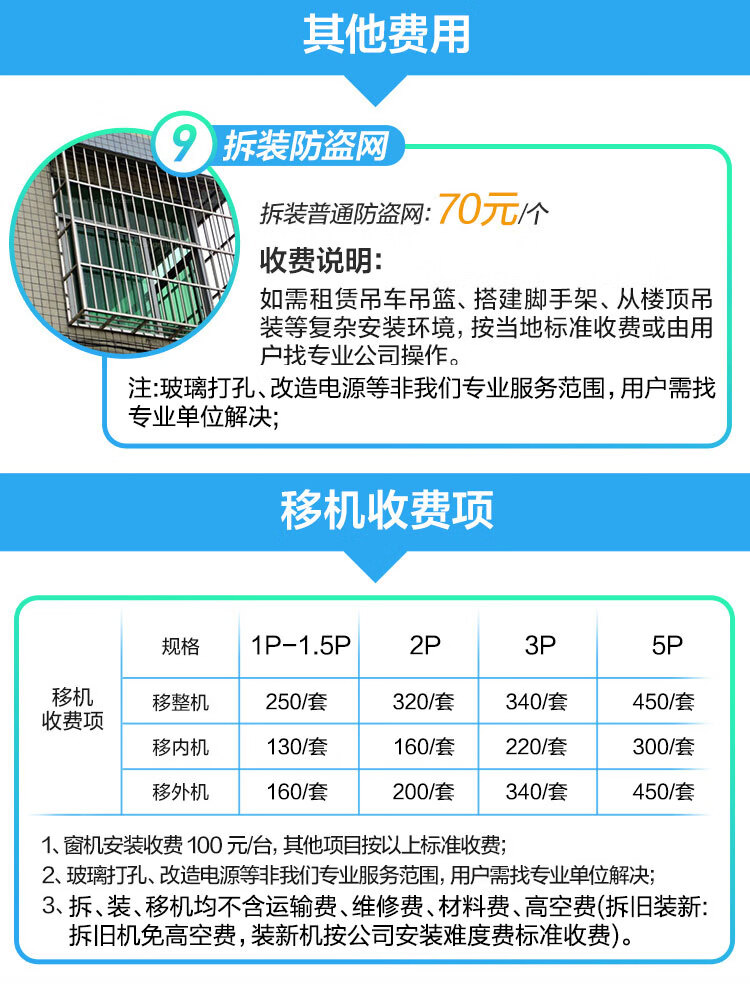 如需使用其他辅材或钻墙打孔、拆机、吊装、高空作业费等不在<标准安装>的免费范围内,费用需自行承担。