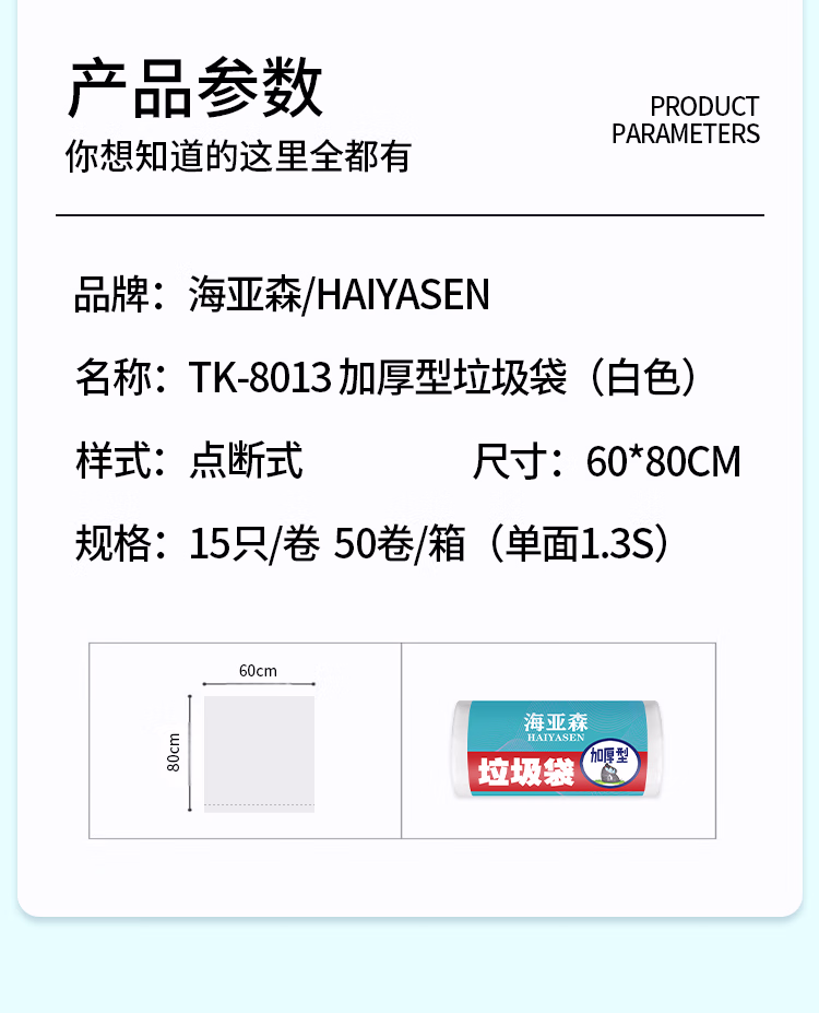 海亚森 TK-8013 60cm*80cm 15只/卷 50卷/箱 加厚型垃圾袋 1.00 包/卷 (计价单位:卷) 白色 3卷起订