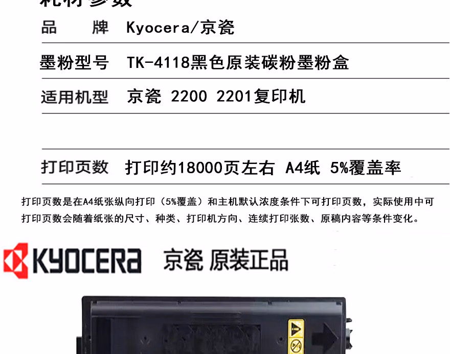 京瓷(KYOCERA) TK-4118带芯片 打印量:18000页 适用京瓷TASKalfa 2200/2201 墨粉盒 1.00 只/支 (计价单位:支) 黑色
