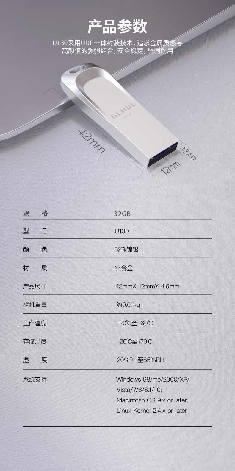 杰储(GCHUL) U130 旭日系列 32G USB3.1 防水防震高速U盘/优盘 (计价单位:个) 银色