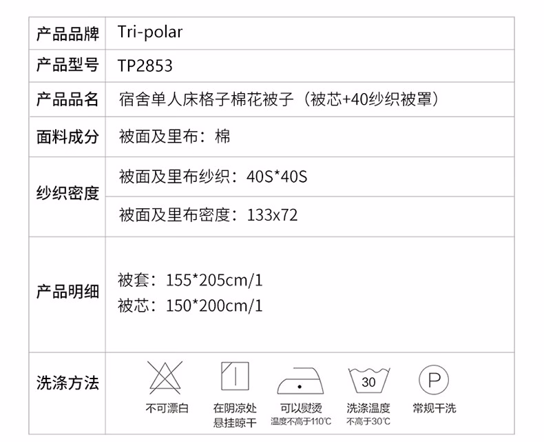 三极户外(Tri-Polar) TP2853 155*205cm 羽丝棉被芯+40纱织全棉被罩 七彩大格 被子 (计价单位:件) 七彩大格