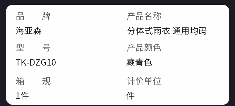 海亚森 TK-DZG10 分体式 均码 雨衣 (计价单位:件) 藏青色