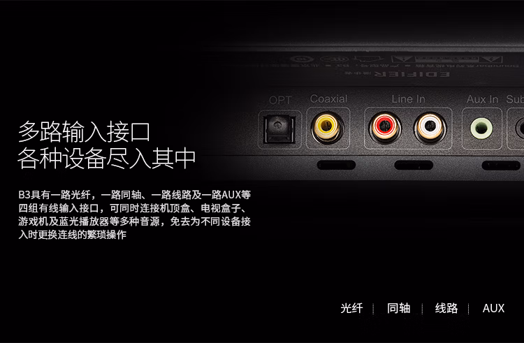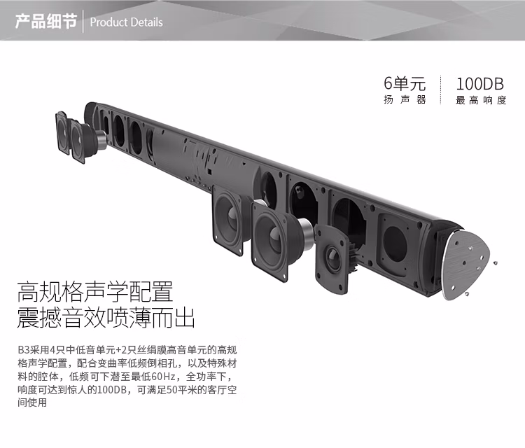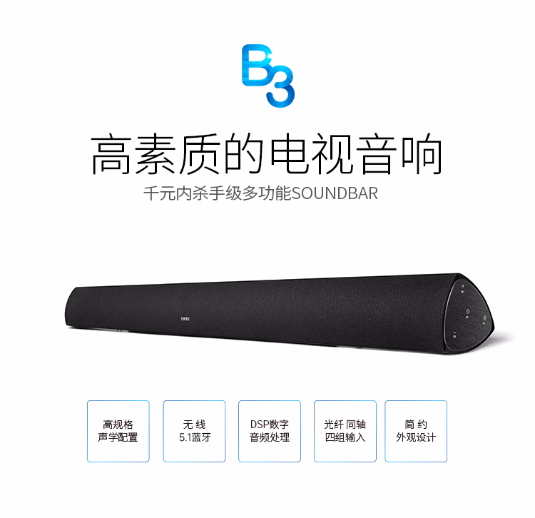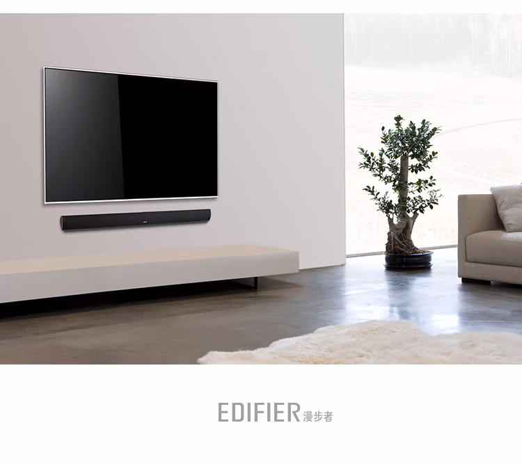 漫步者SOUNDBAR系统电视音响,以全新无线5.1蓝牙技术, 高端DSP数字音频处理,全规格输入端子连接,3D、影院、新闻三种声场模式,以及 70W不失真功率,100DB高声压级,震撼音效,畅享影音!