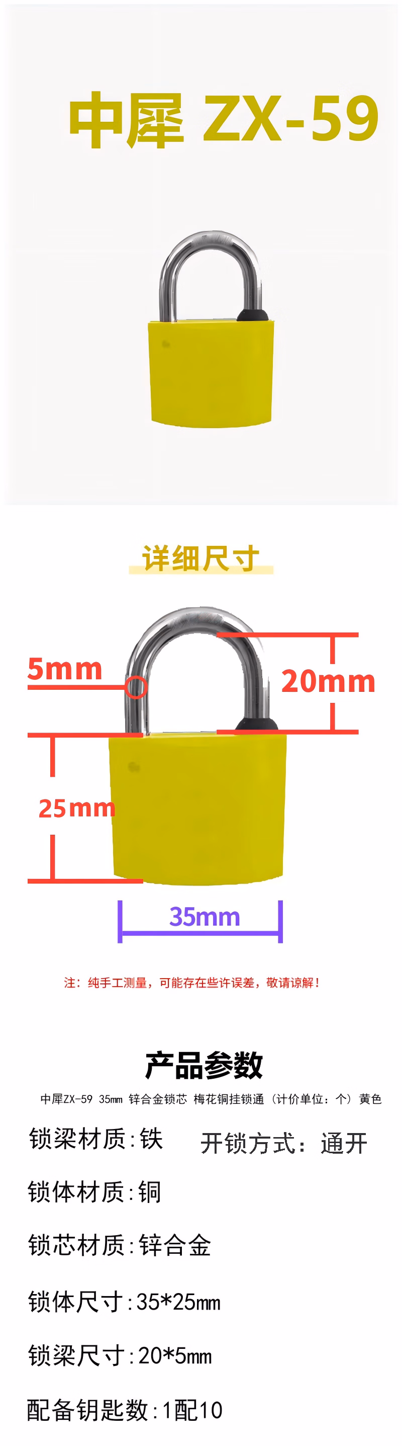 中犀 ZX-59 35mm 锌合金锁芯 梅花铜 挂锁 (计价单位:个) 黄色